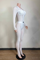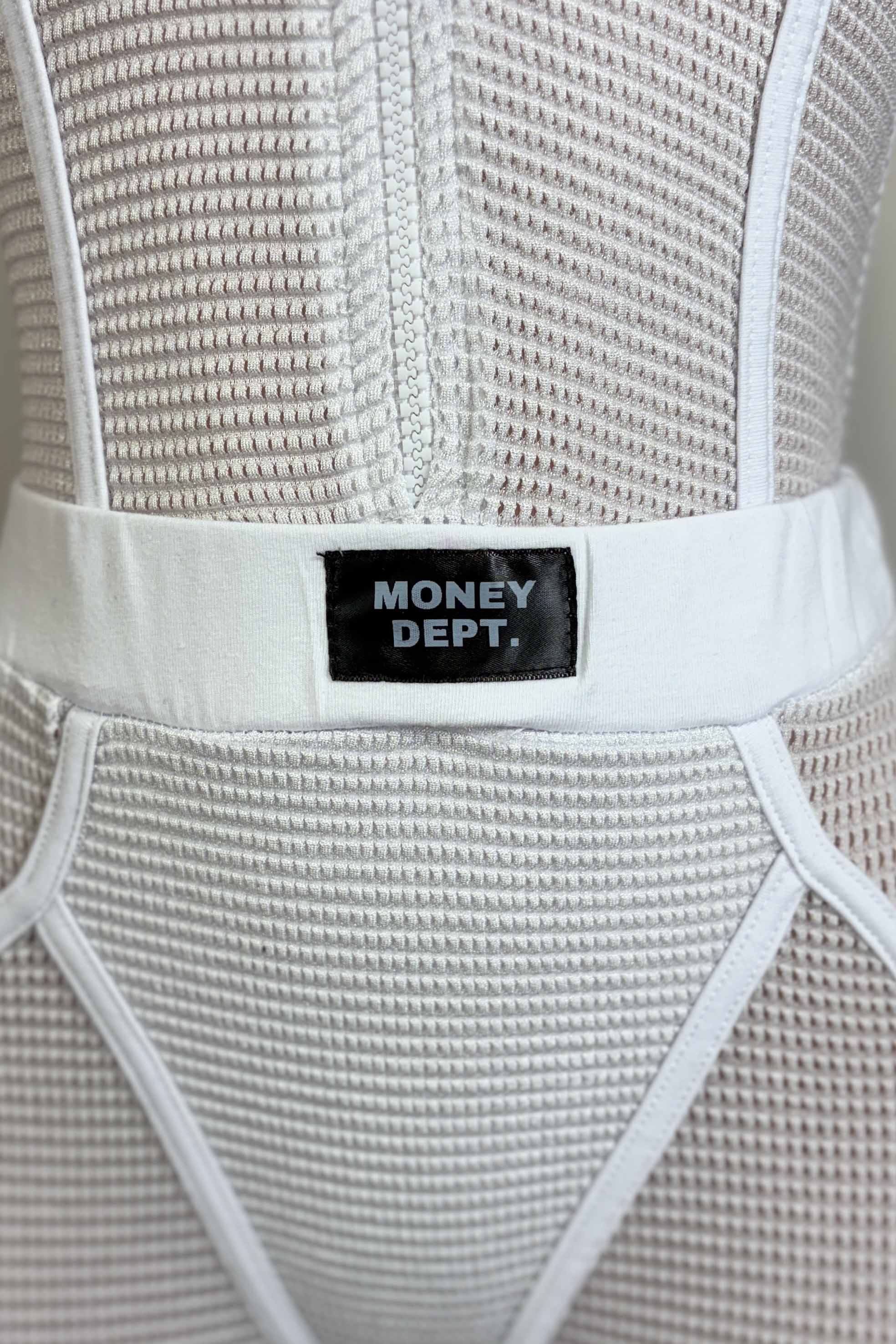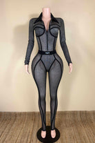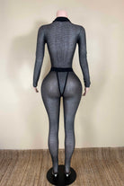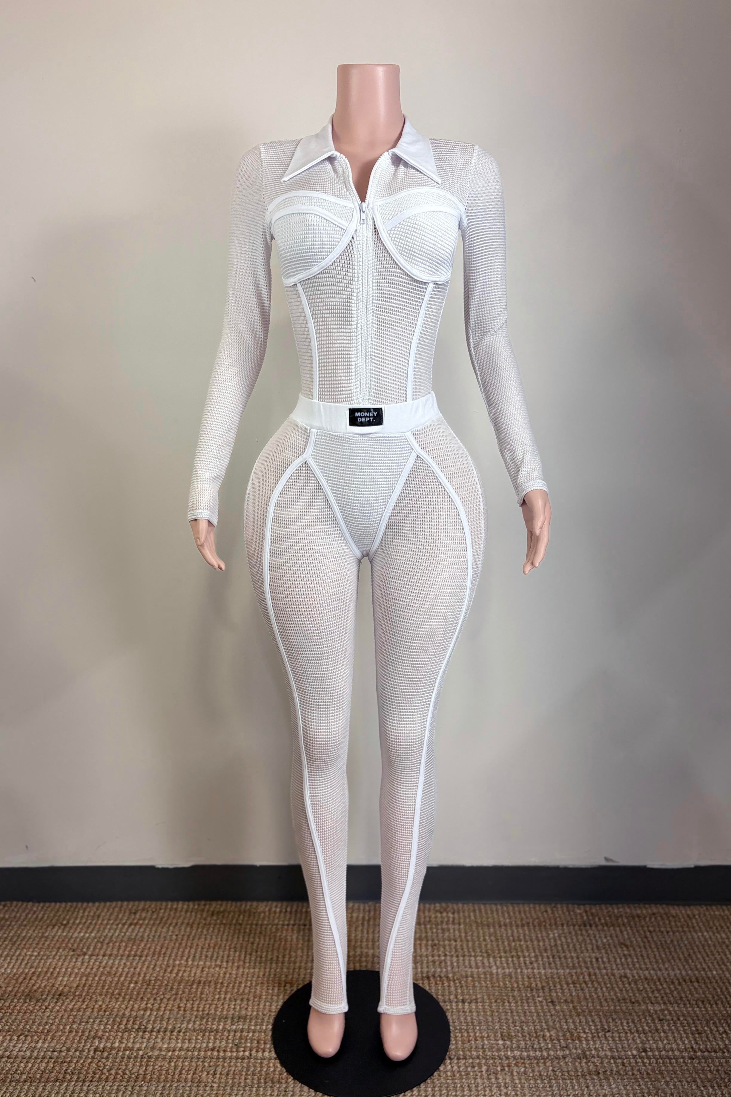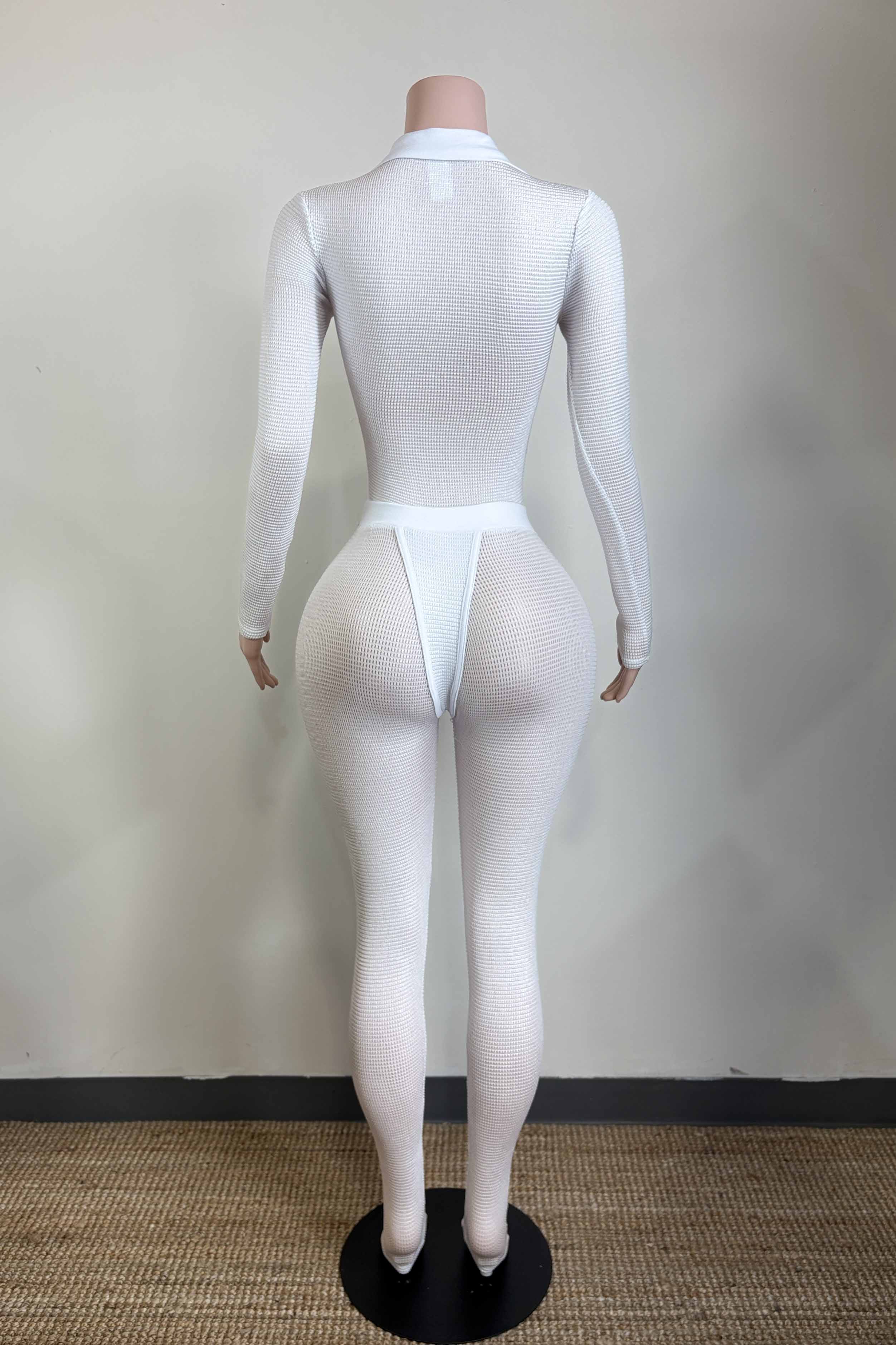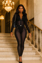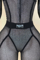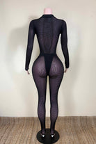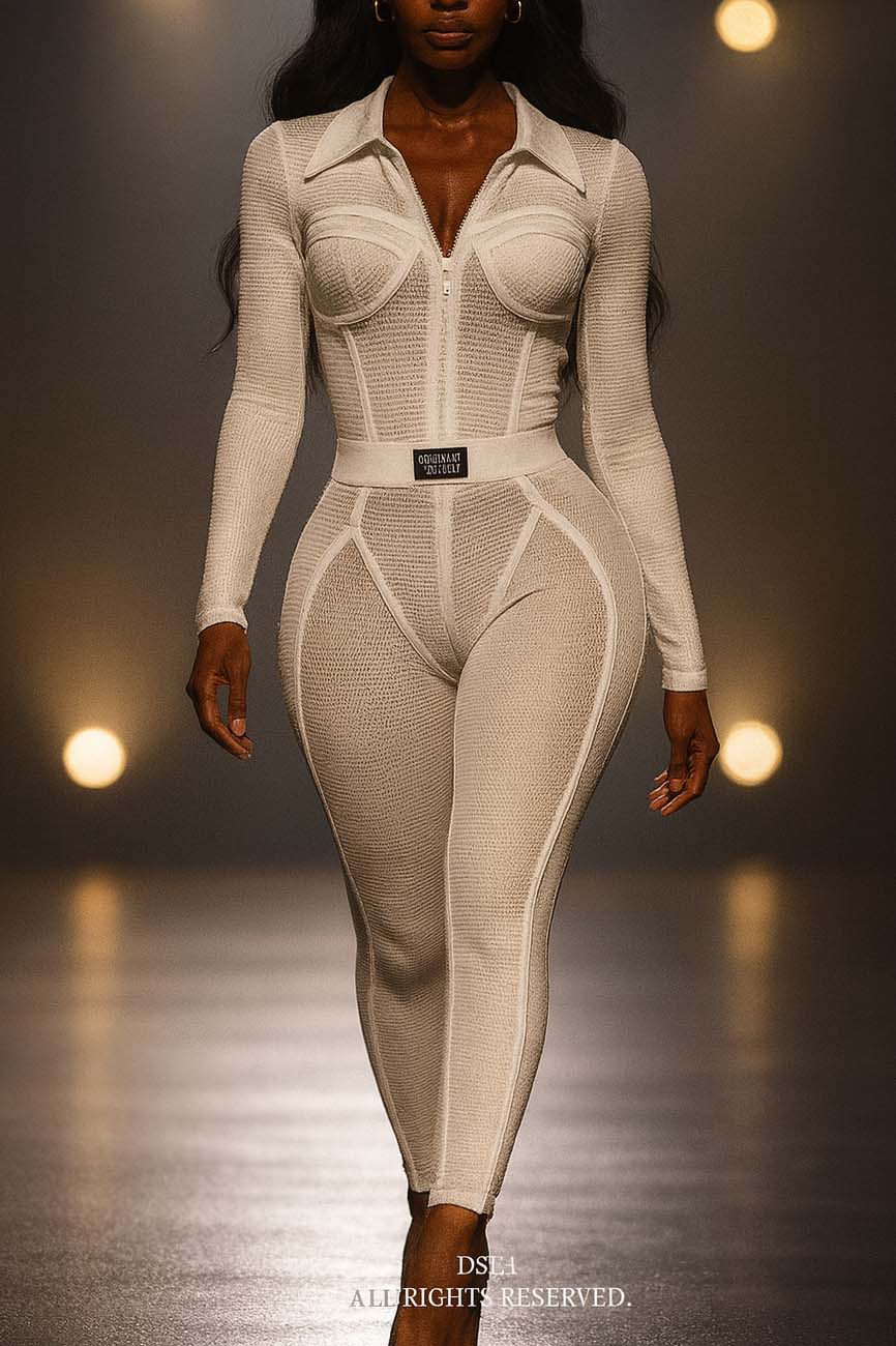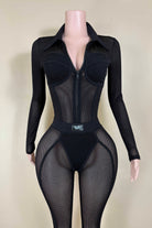 -POPCORN MESH SHEER MATERIAL-COLLARED-FRONT ZIPPER-ELASTIC WAISTBAND-BLACK SATIN LABEL DETAIL-STRETCH-BODYCON