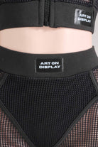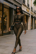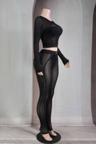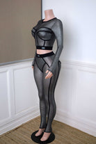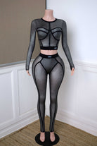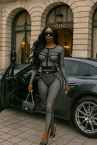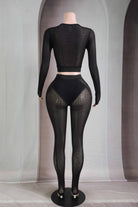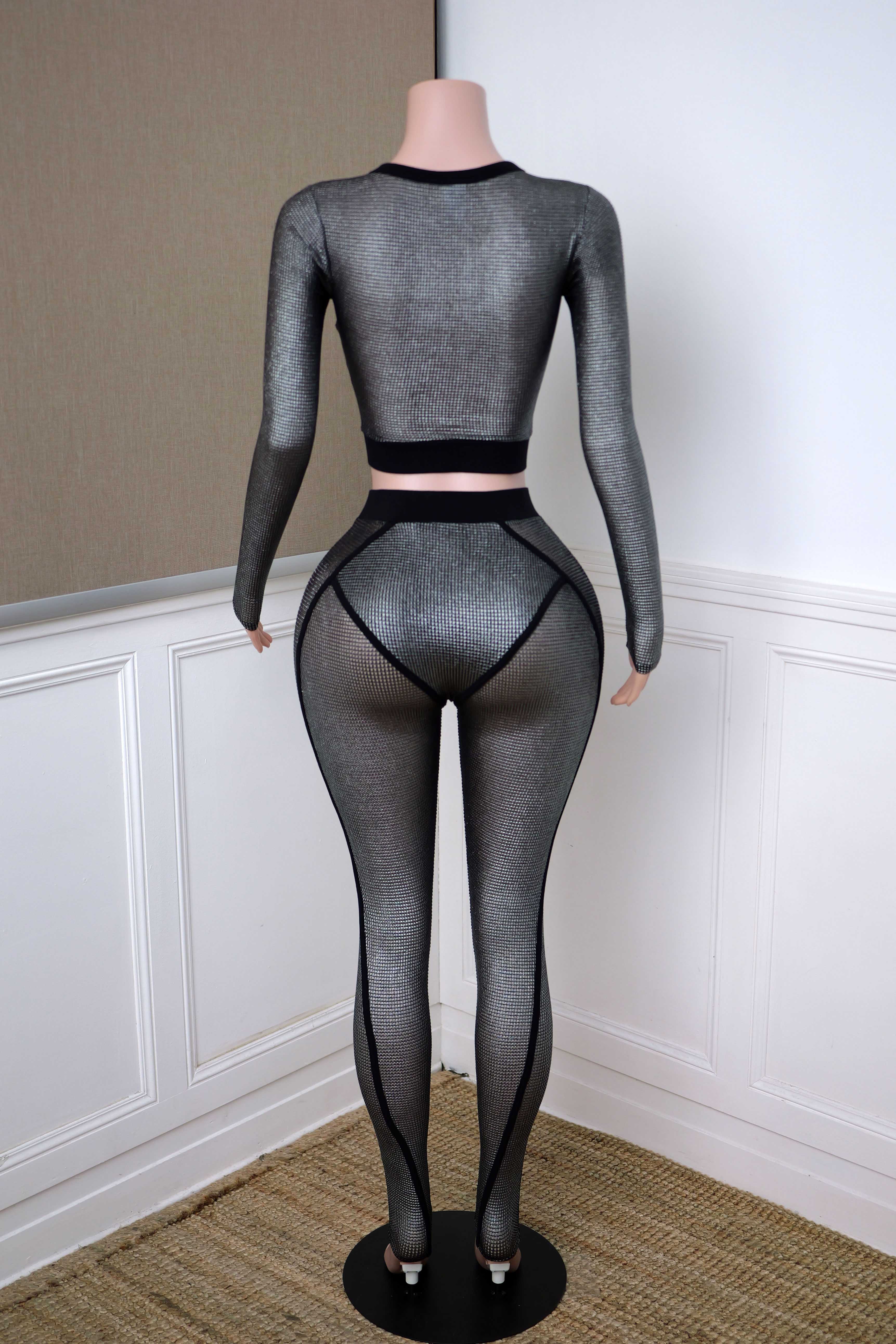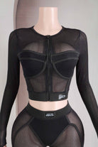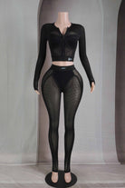-POPCORN MESH-SET COMES WITH TOP & BOTTOM-BLACK SATIN LABEL DETAIL-SEE THROUGH-FRONT ZIPPER CROPPED JACKET-ELASTIC WAIST LEGGING-STRETCH