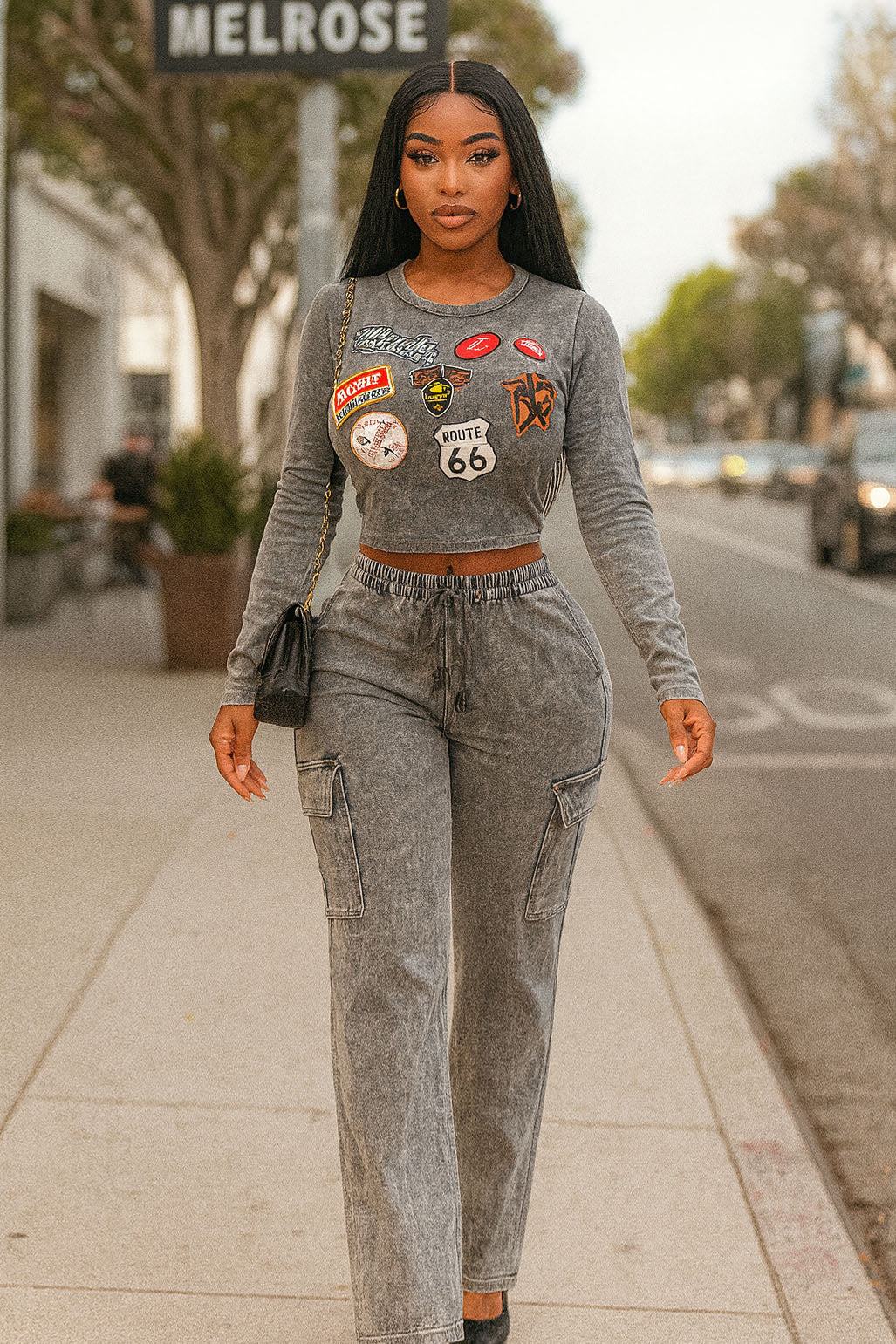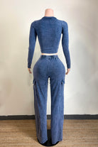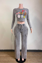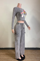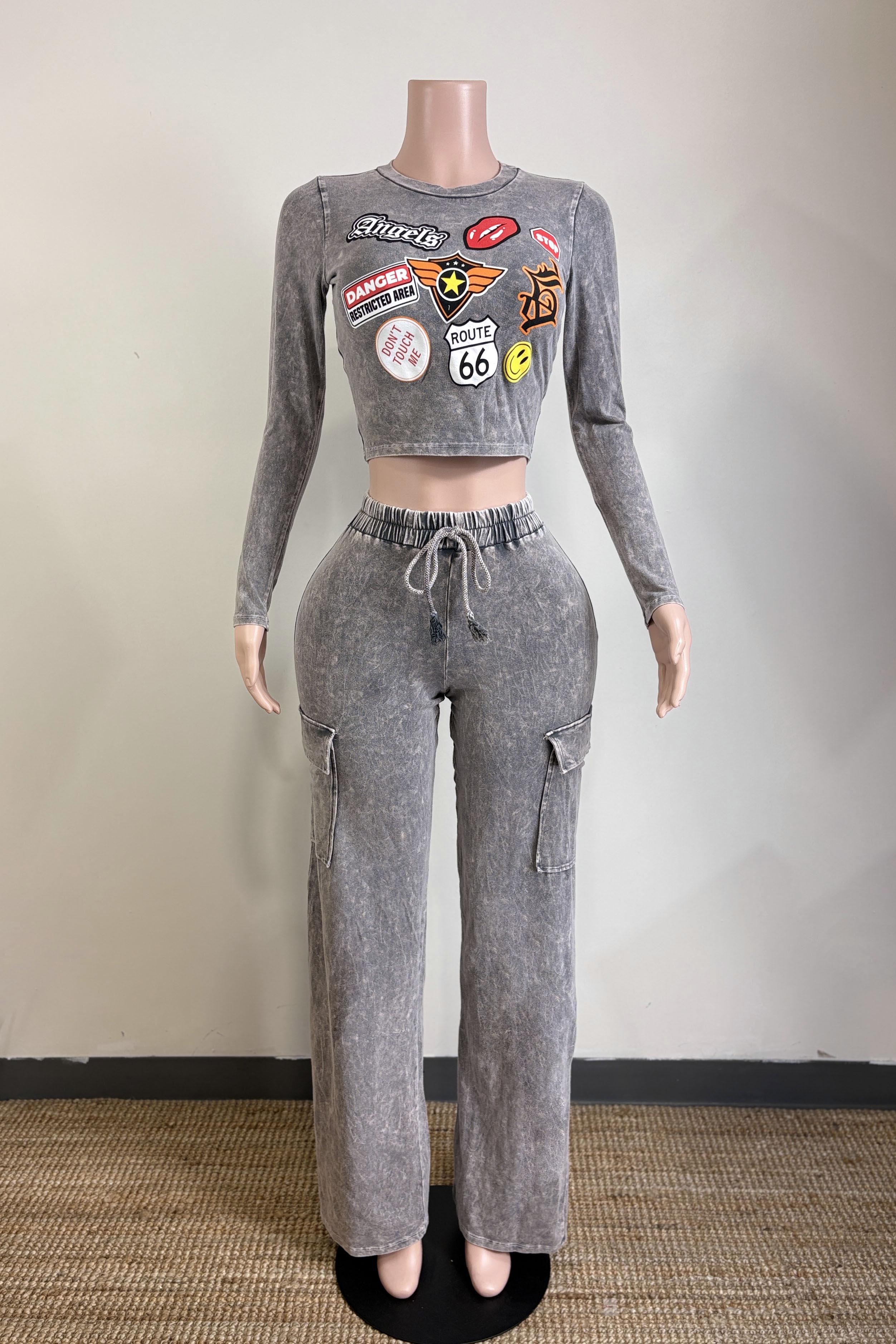 -MINERAL WASH-SET COMES WITH TOP & BOTTOM-PATCH PRINT-CROPPED LONG SLEEVE-ELASTIC WAISTBAND WITH FAUX TIE-SIDE POCKET-TALL GIRL FRIENDLY-STRETCH