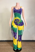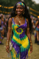 MARDI GRAS SWIRL TIE DYE OPEN BACK FRINGE JUMPSUIT