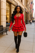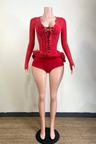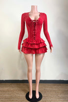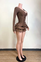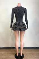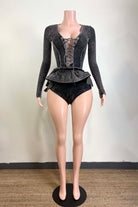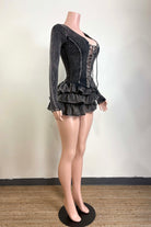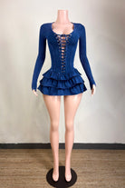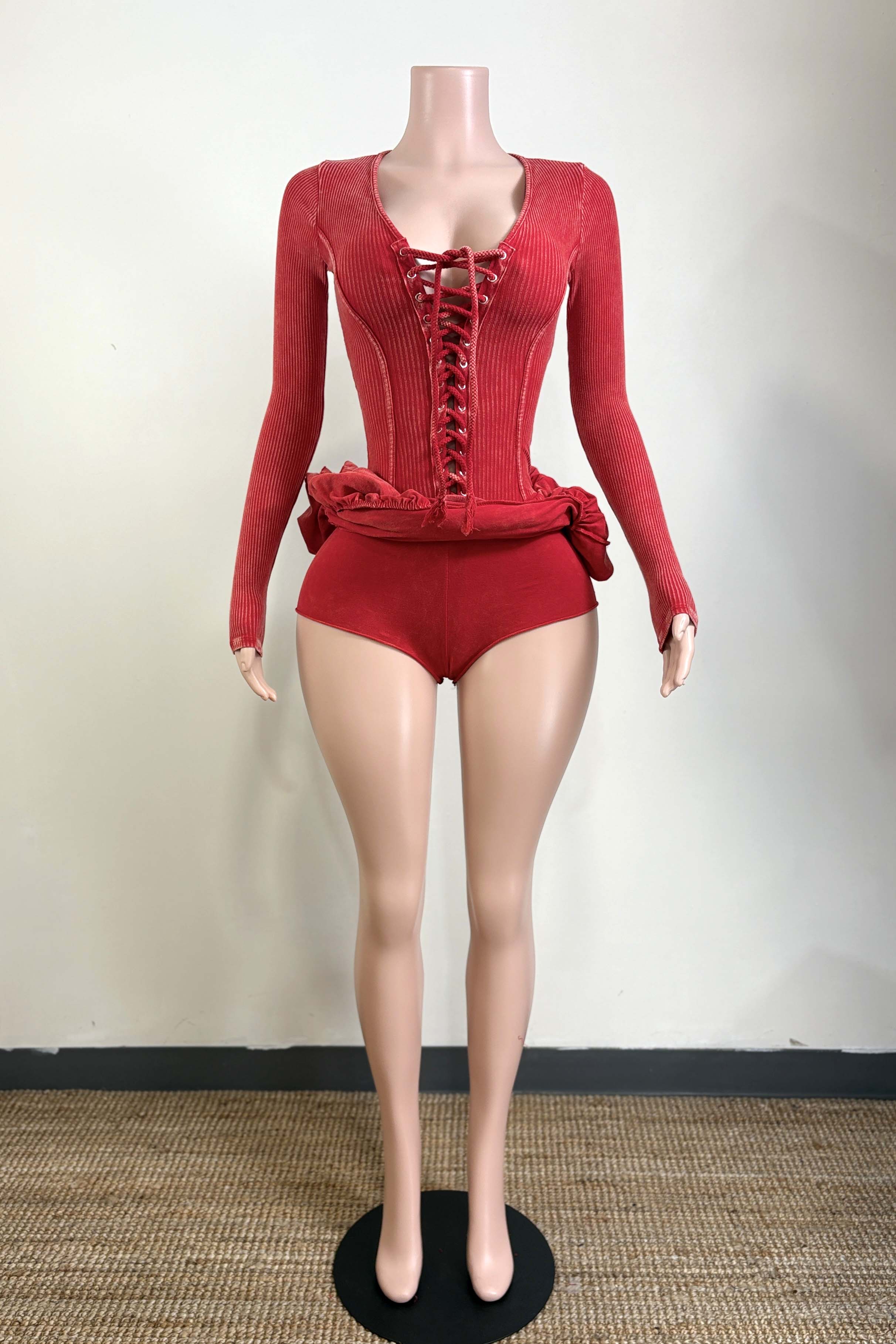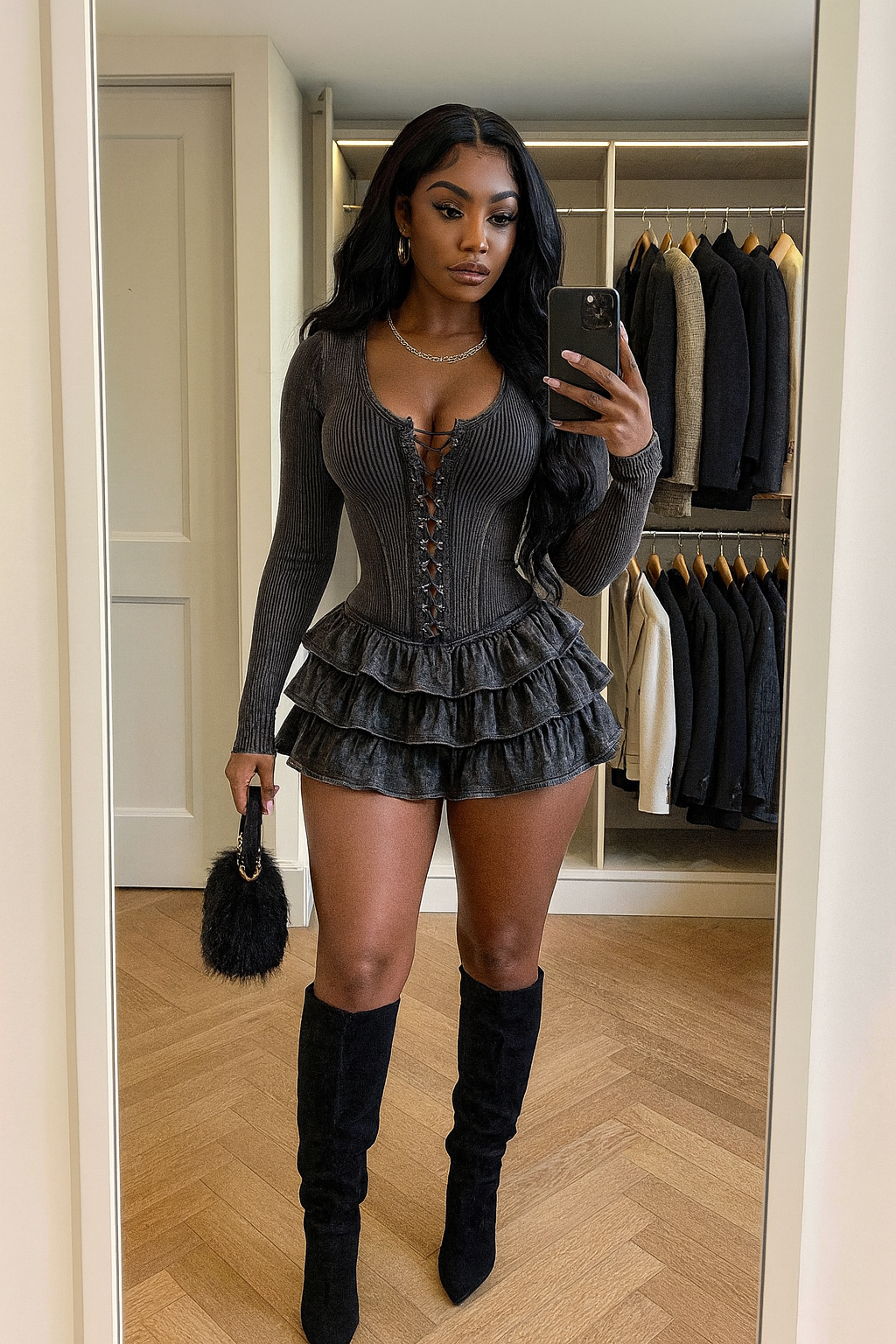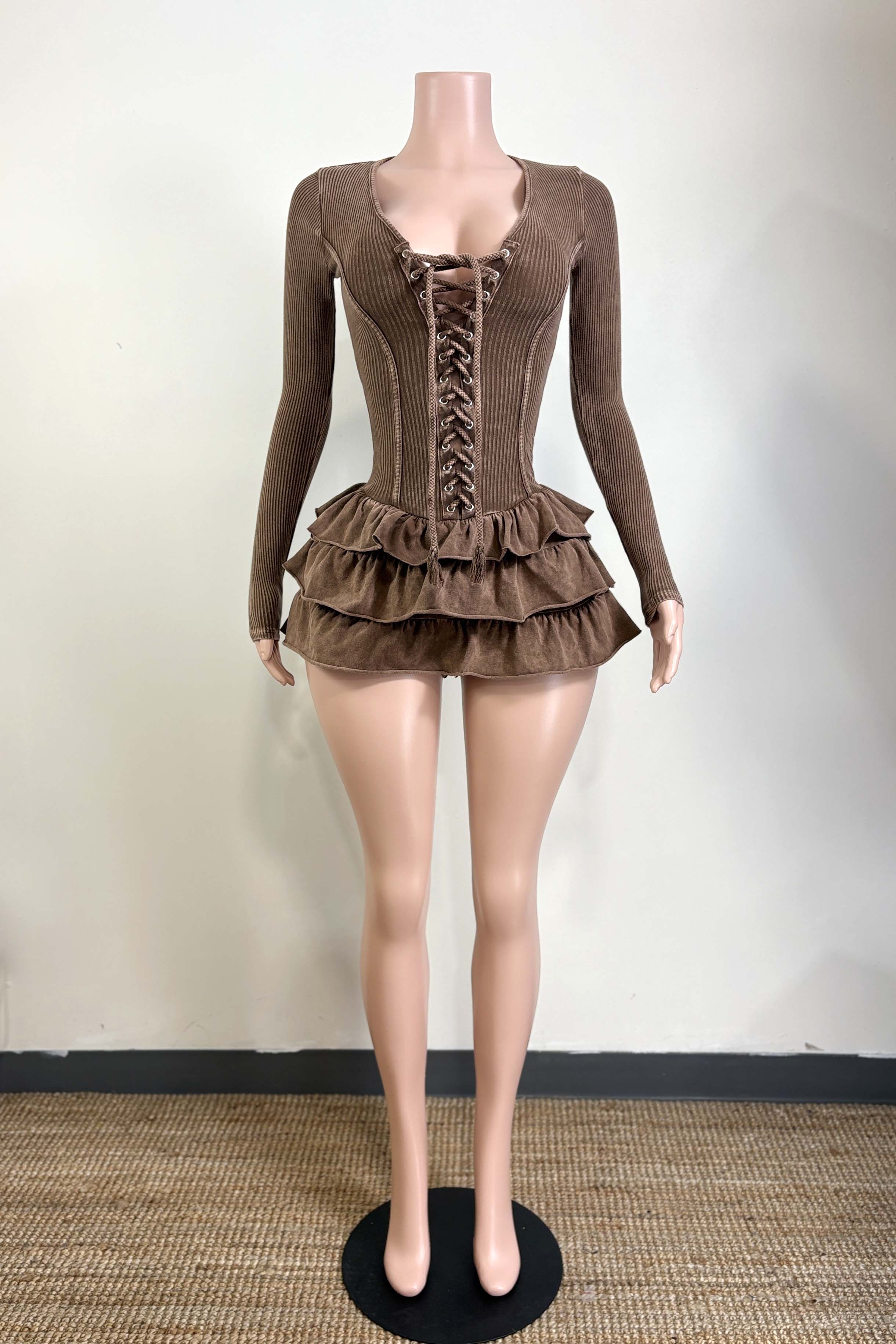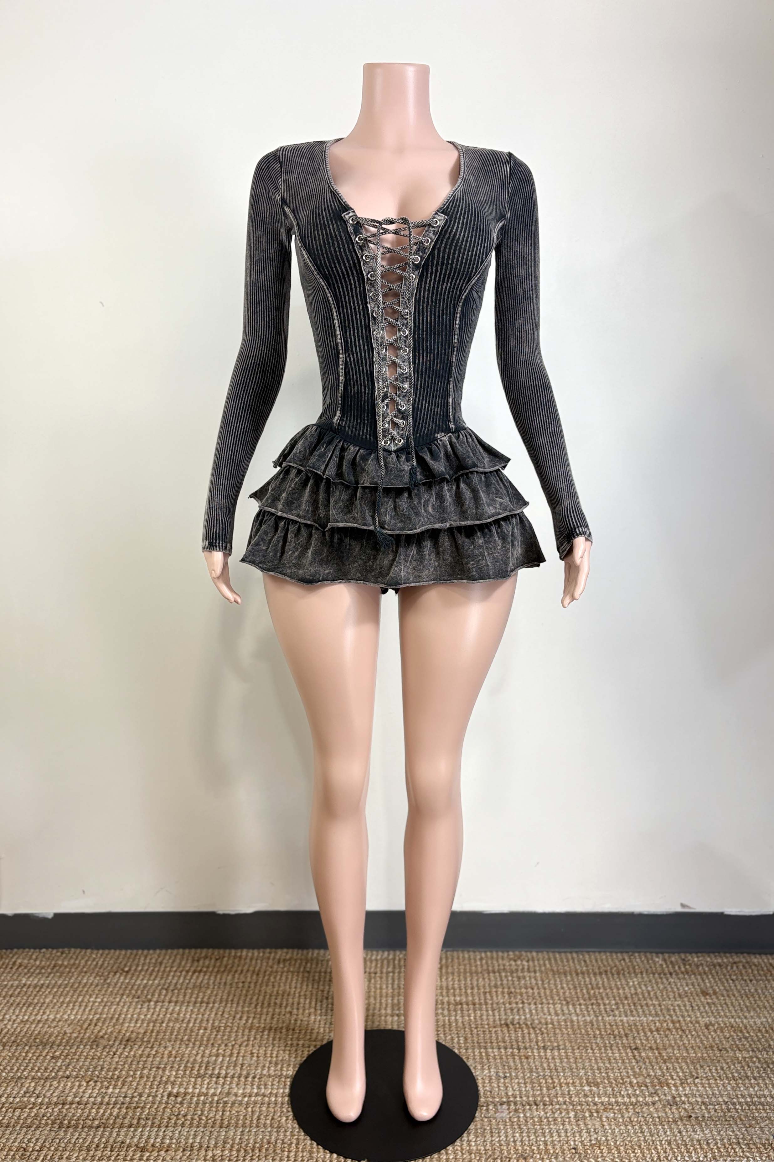 MINERAL WASH FRONT LACE DETAIL TIERED SKIRT ROMPER