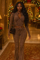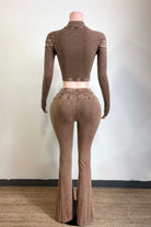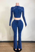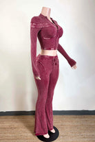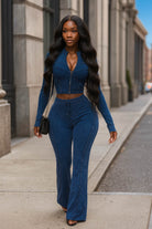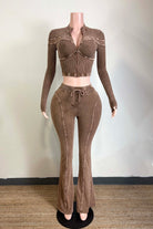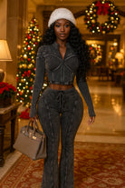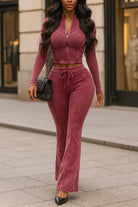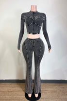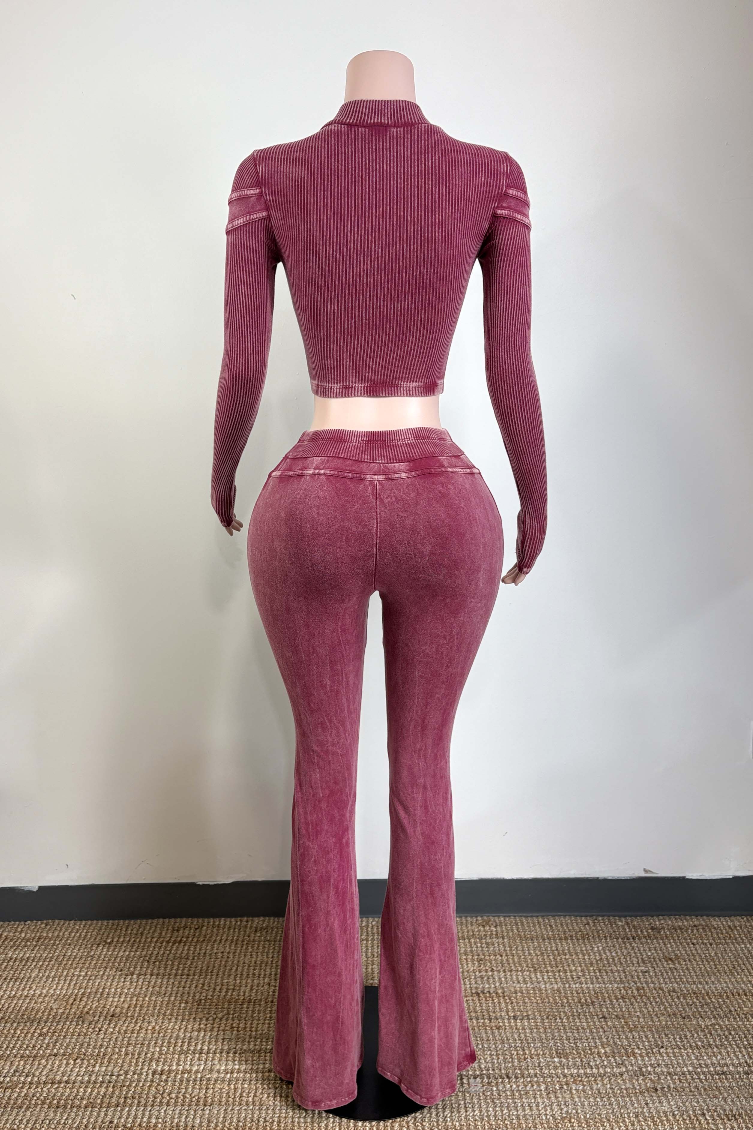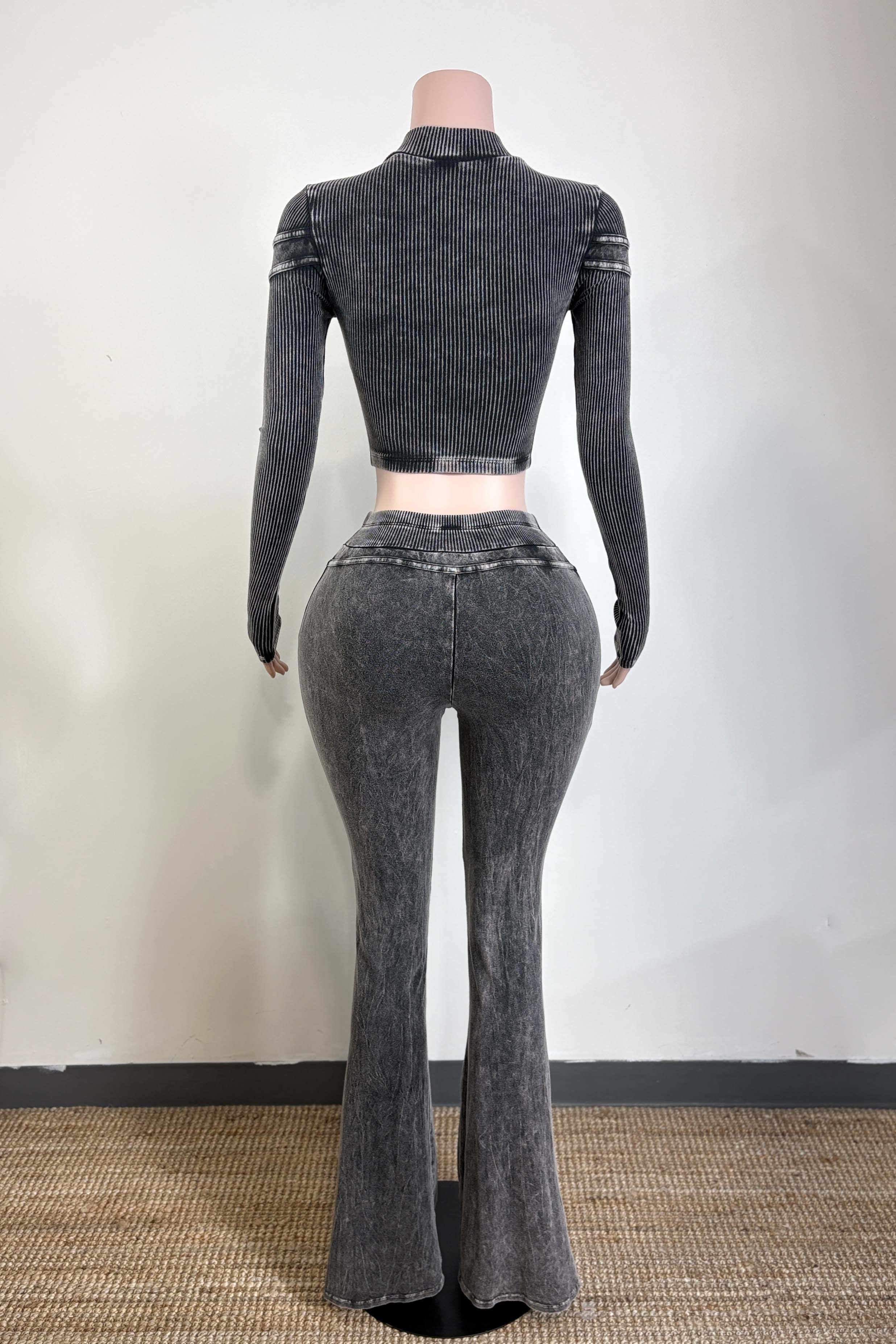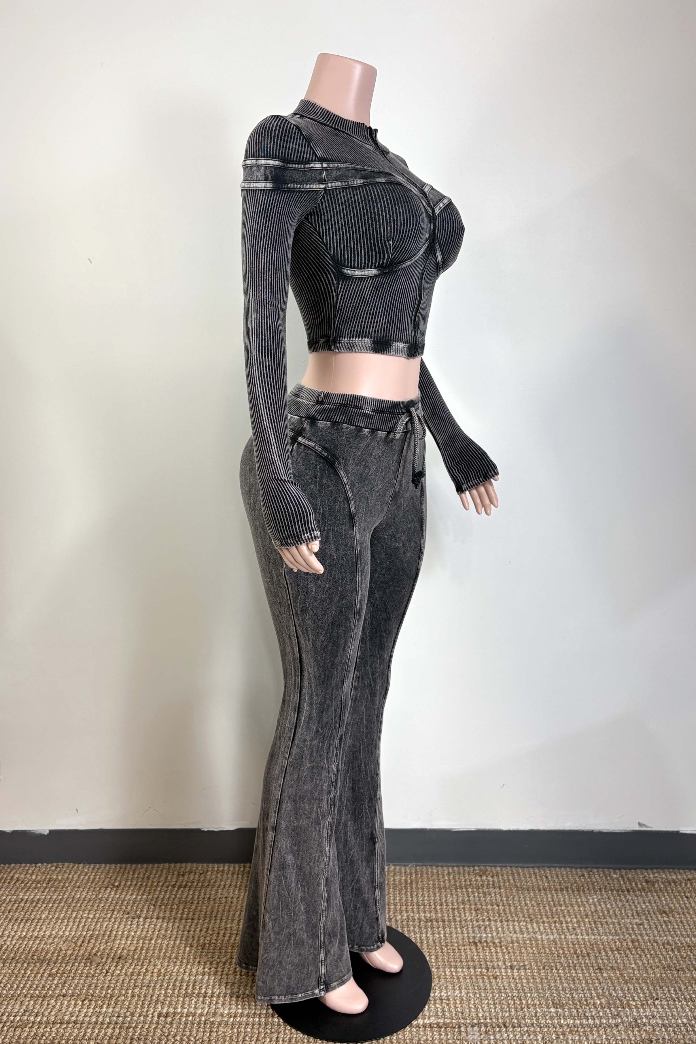 -MINERAL WASH-SET COMES WITH TOP & BOTTOM-FRONT ZIP-UP-CONTOUR LINING-STRETCH-ELASTIC WAIST AND FAUX TIE-FLARE-TALL GIRL FRIENDLY