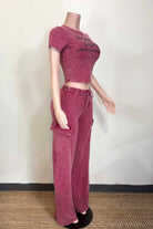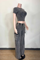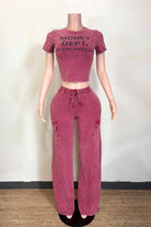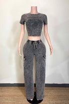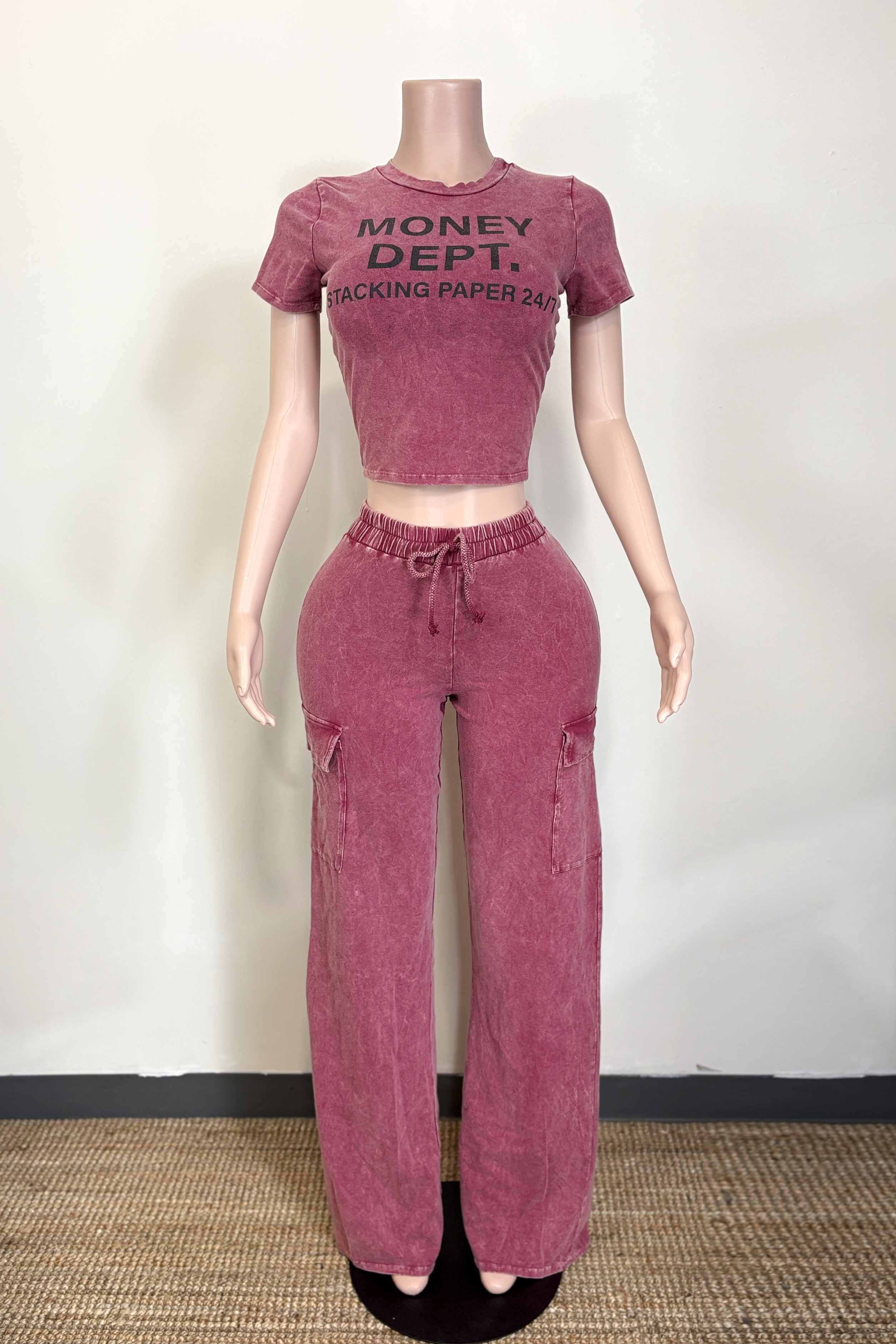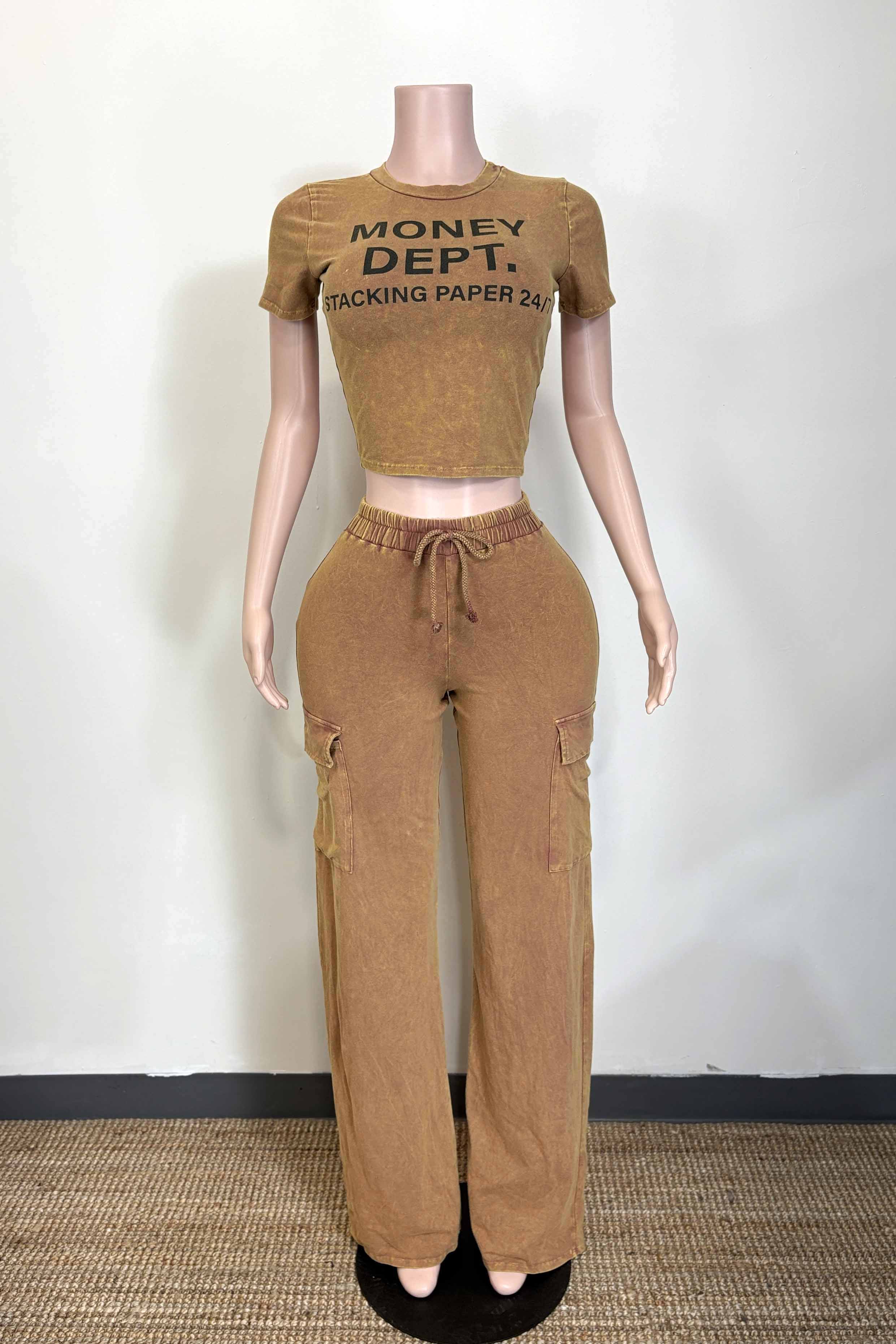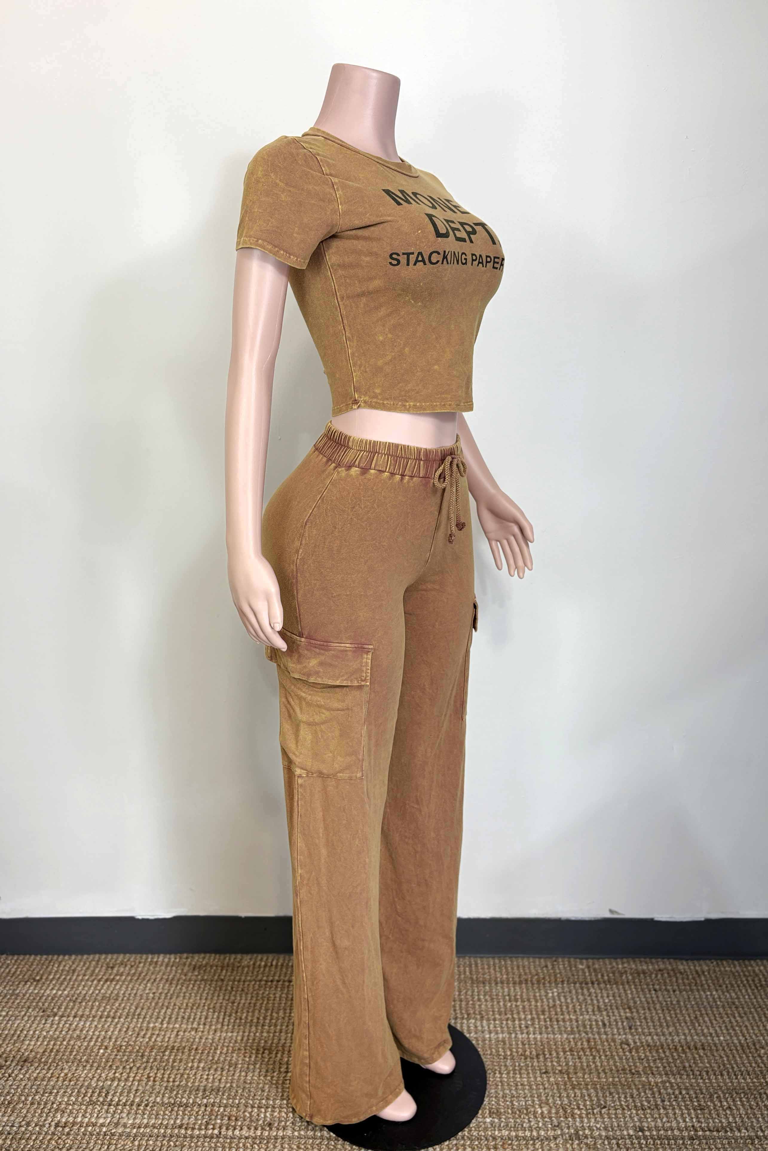 -MINERAL WASH-SET COMES WITH TOP & BOTTOM-FRONT GRAPHIC PRINT-SHORT SLEEVE CROPPED TOP-ELASTIC WAIST PANT-SIDE CARGO POCKET-TALL GIRL FRIENDLY