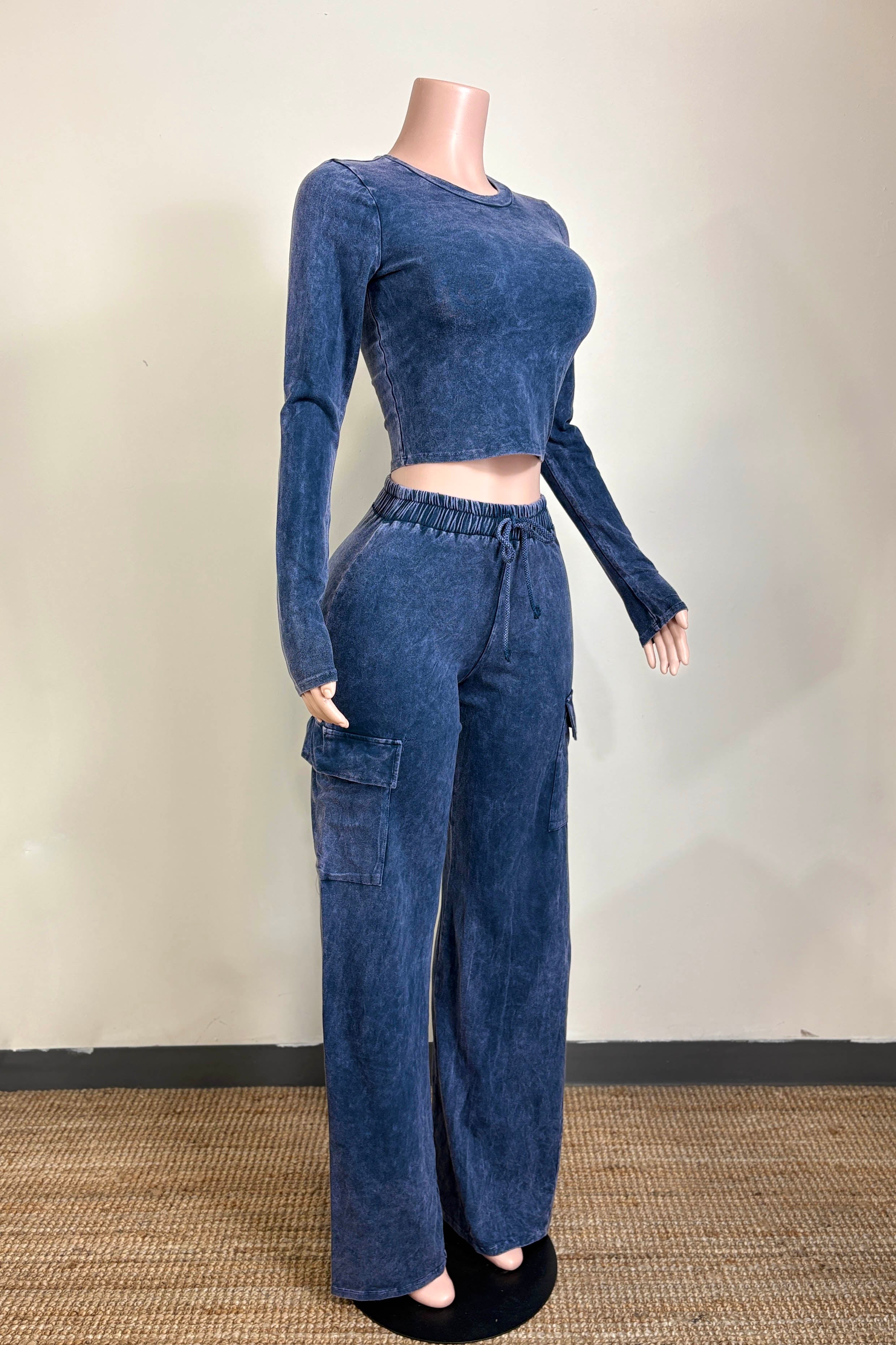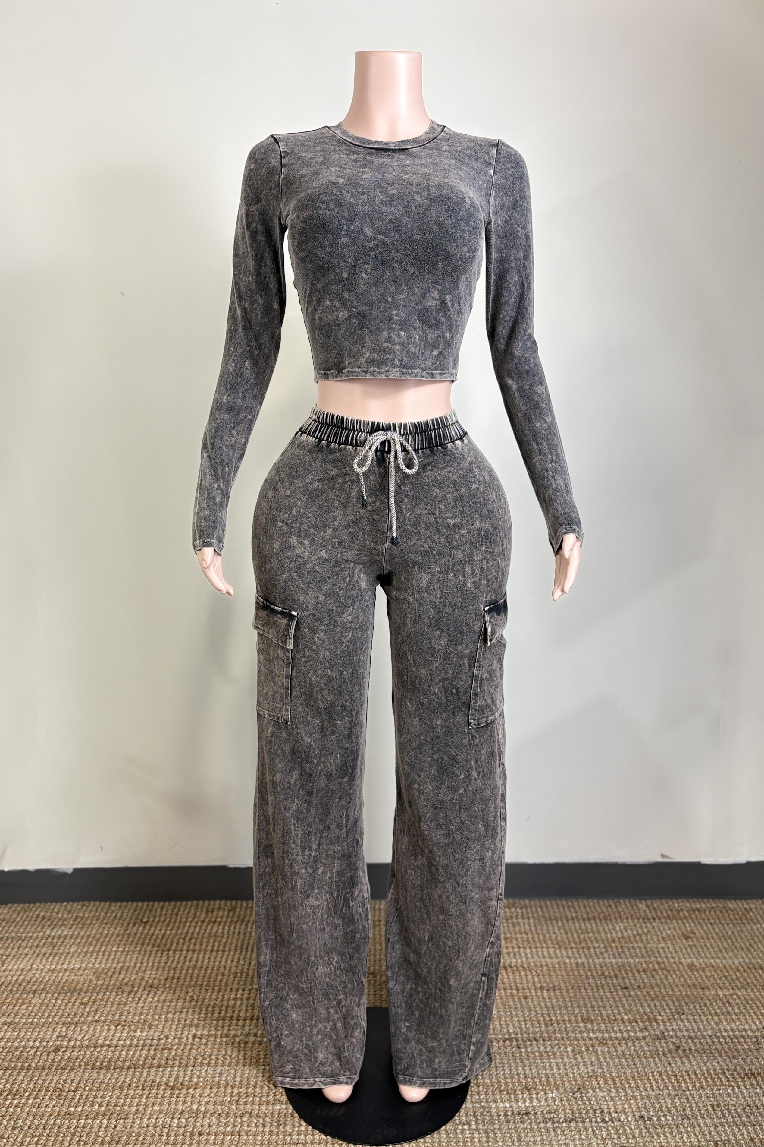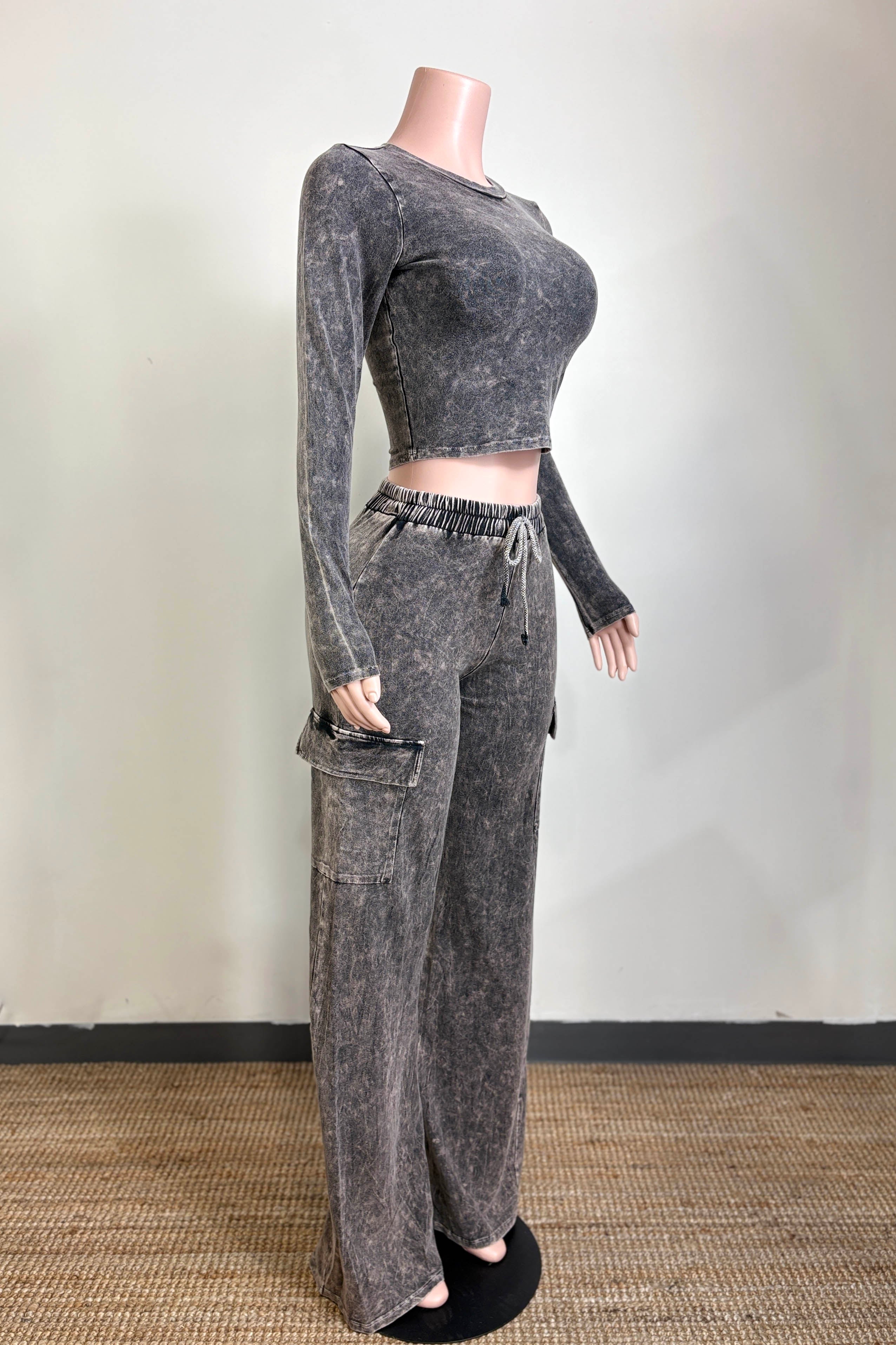 -MINERAL WASH-SET COMES WITH TOP & BOTTOM-CROPPED LONG SLEEVE-ELASTIC WAIST-WIDE LEG-SIDE CARGO POCKET-STRETCH