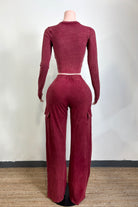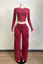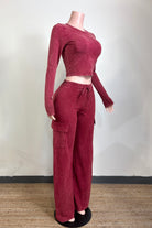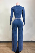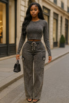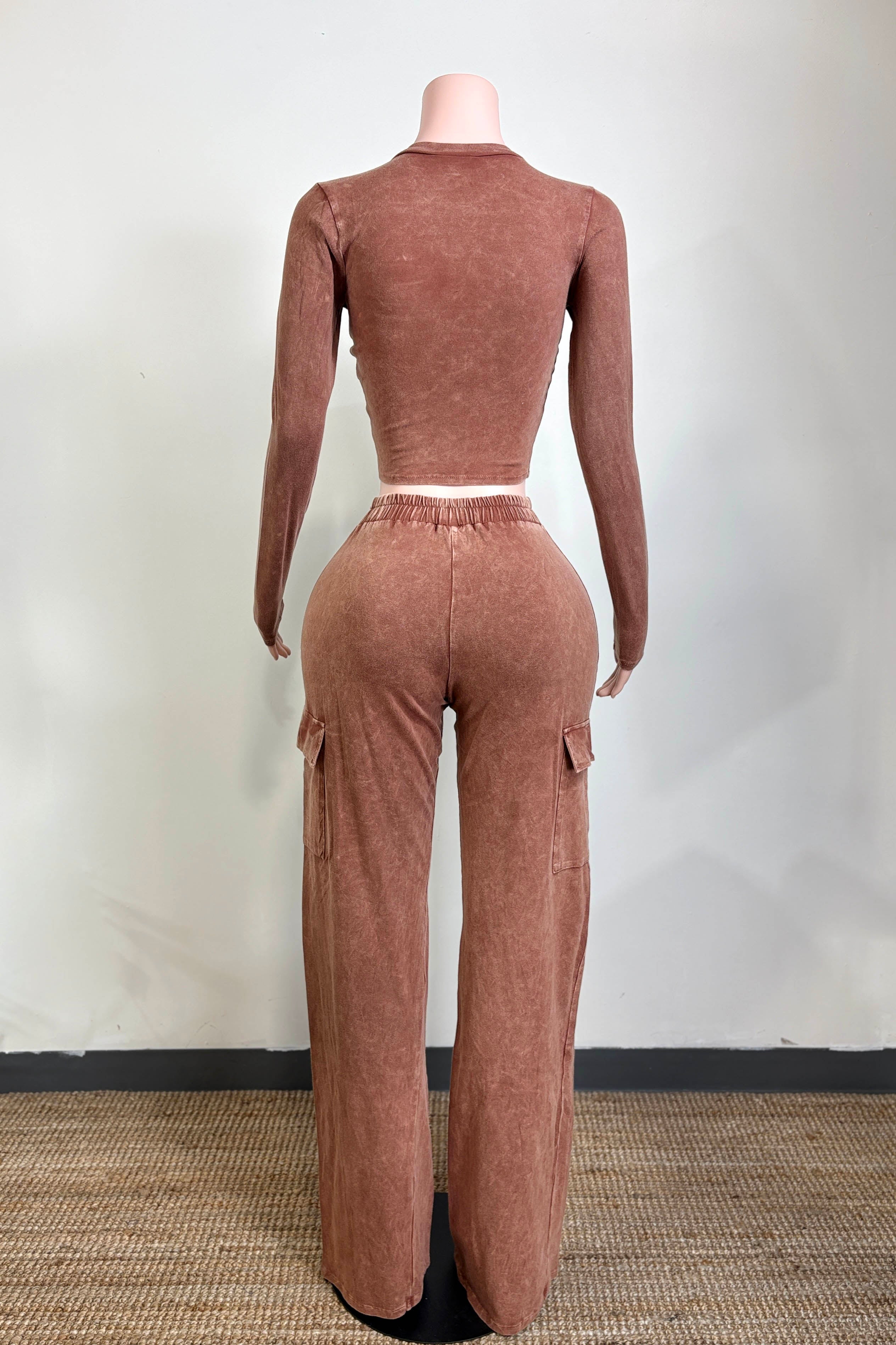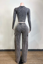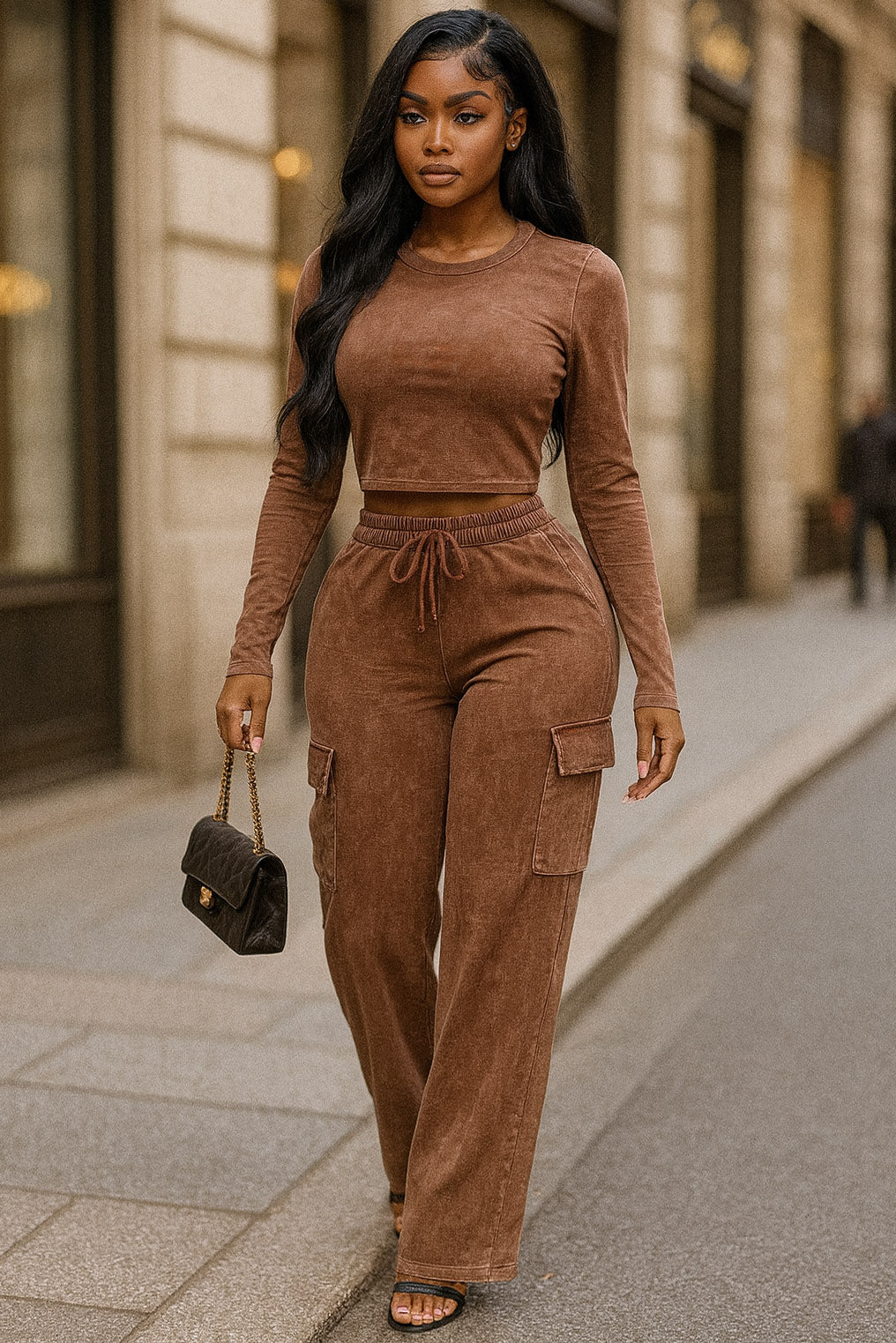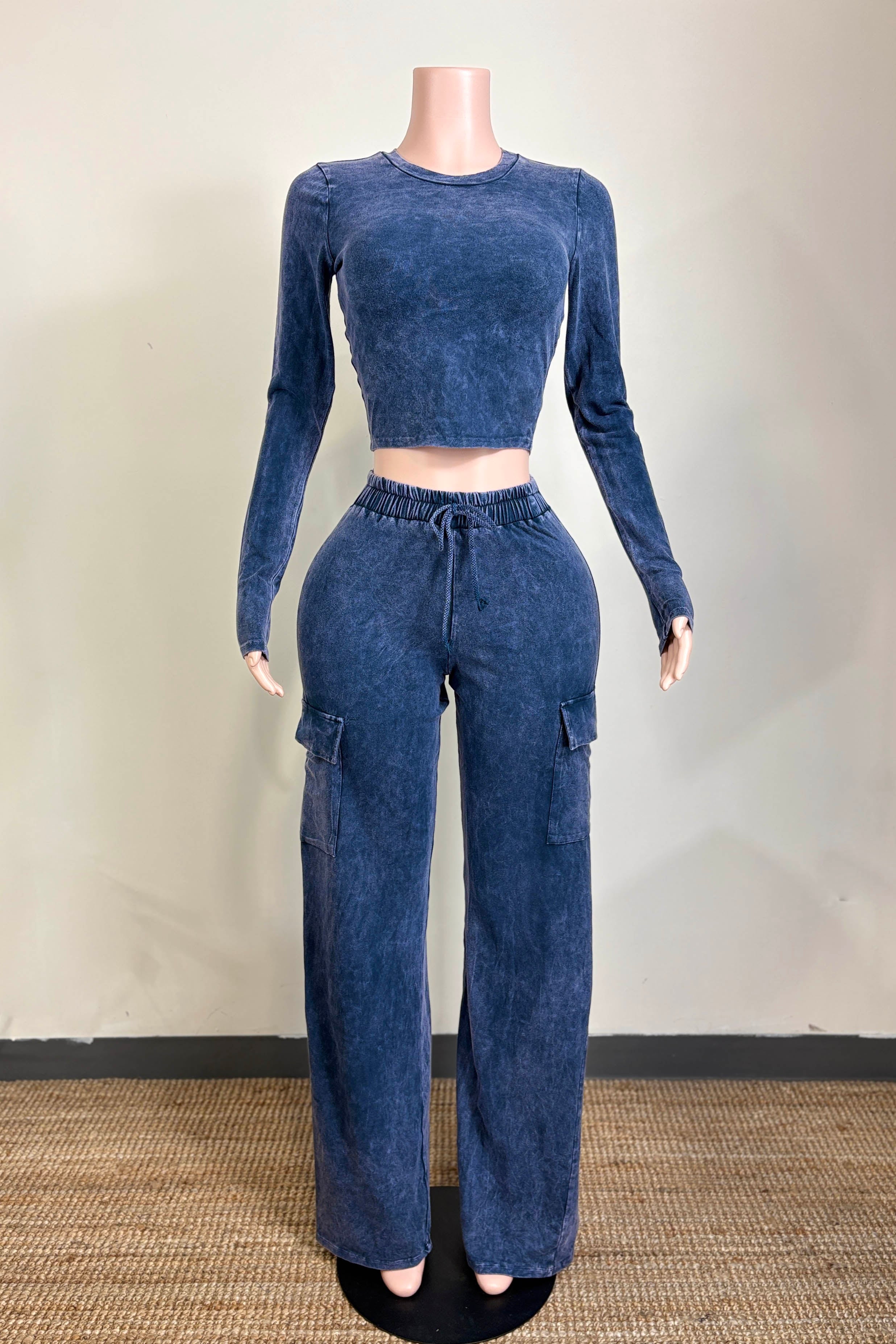 -MINERAL WASH-SET COMES WITH TOP & BOTTOM-CROPPED LONG SLEEVE-ELASTIC WAIST-WIDE LEG-SIDE CARGO POCKET-STRETCH