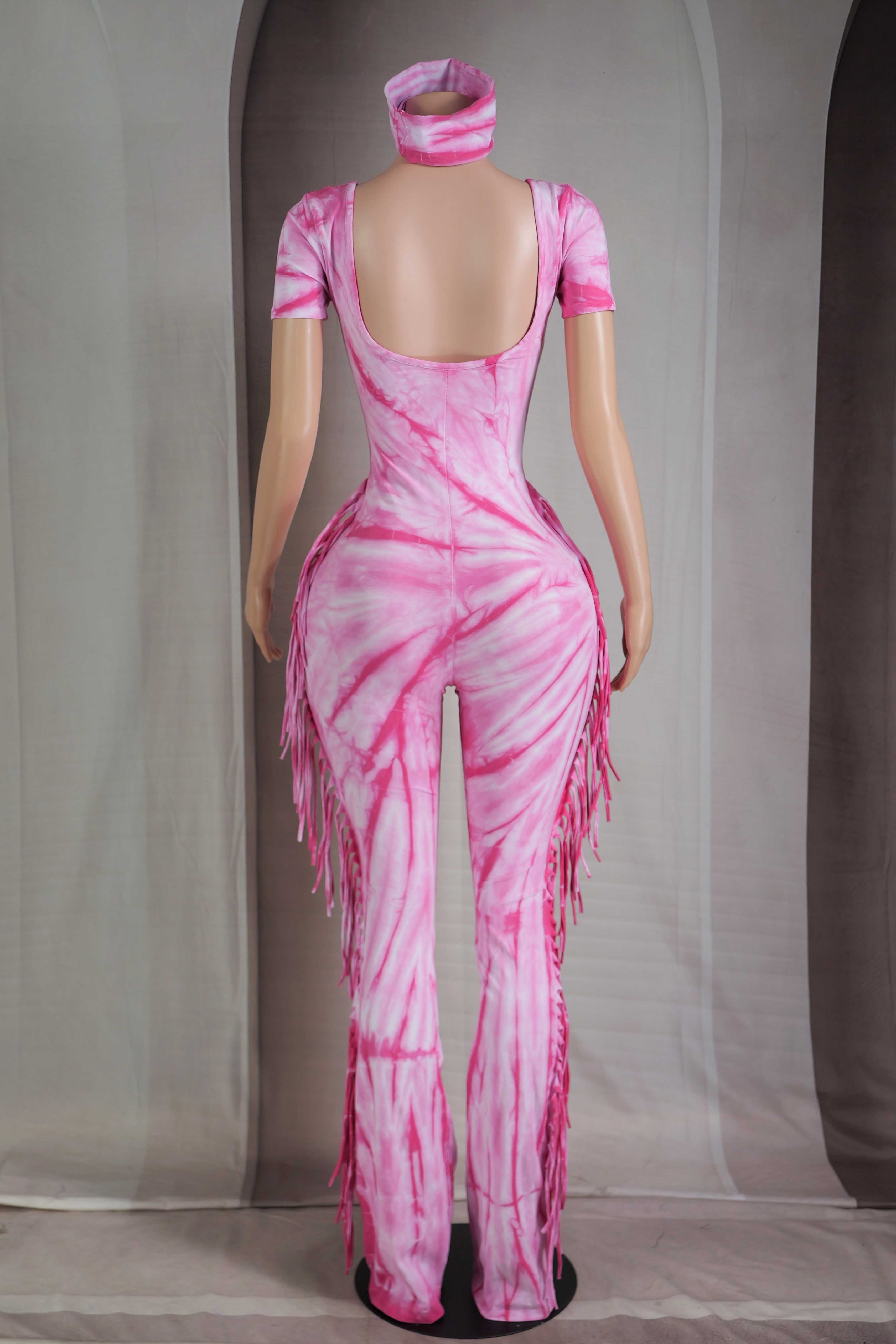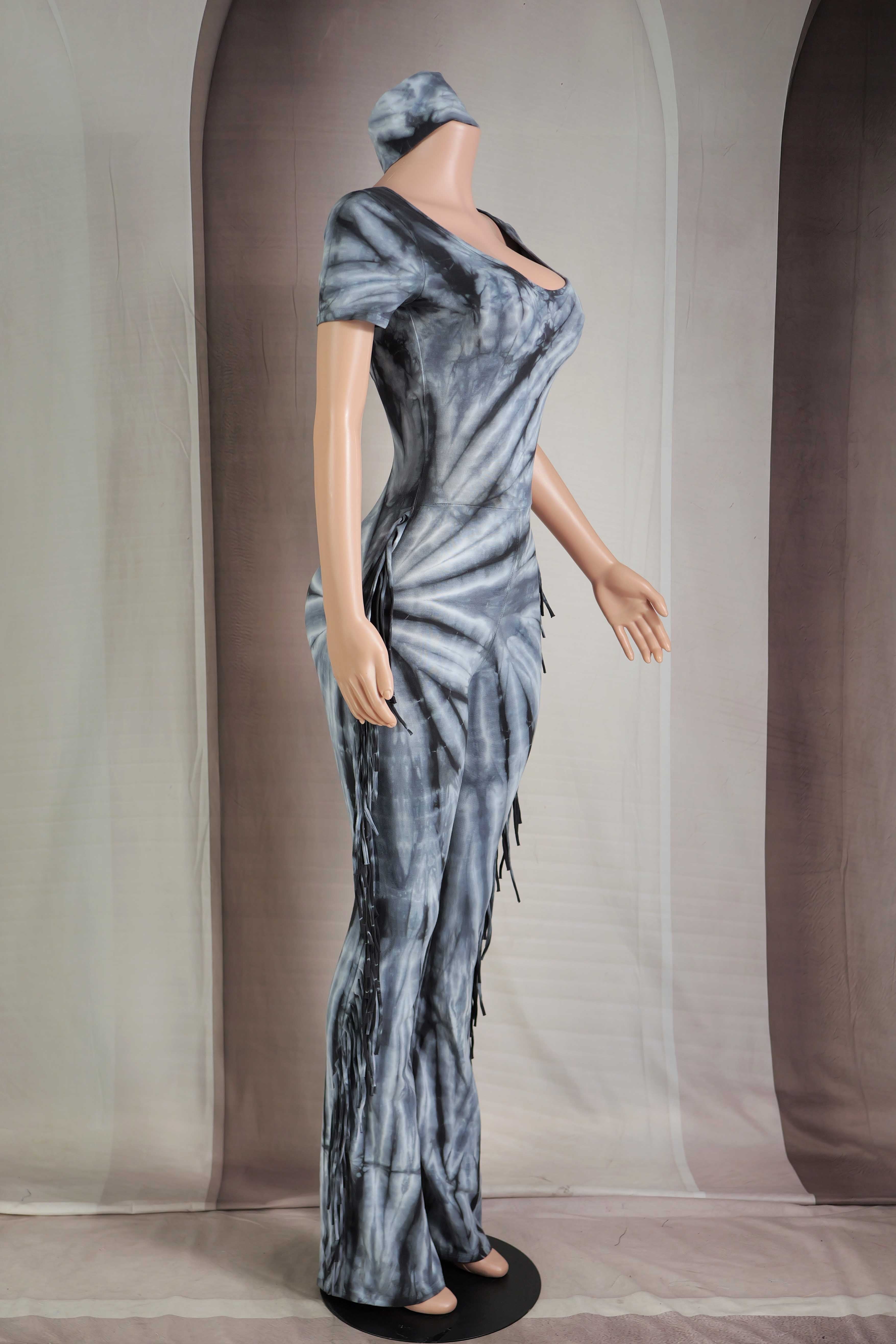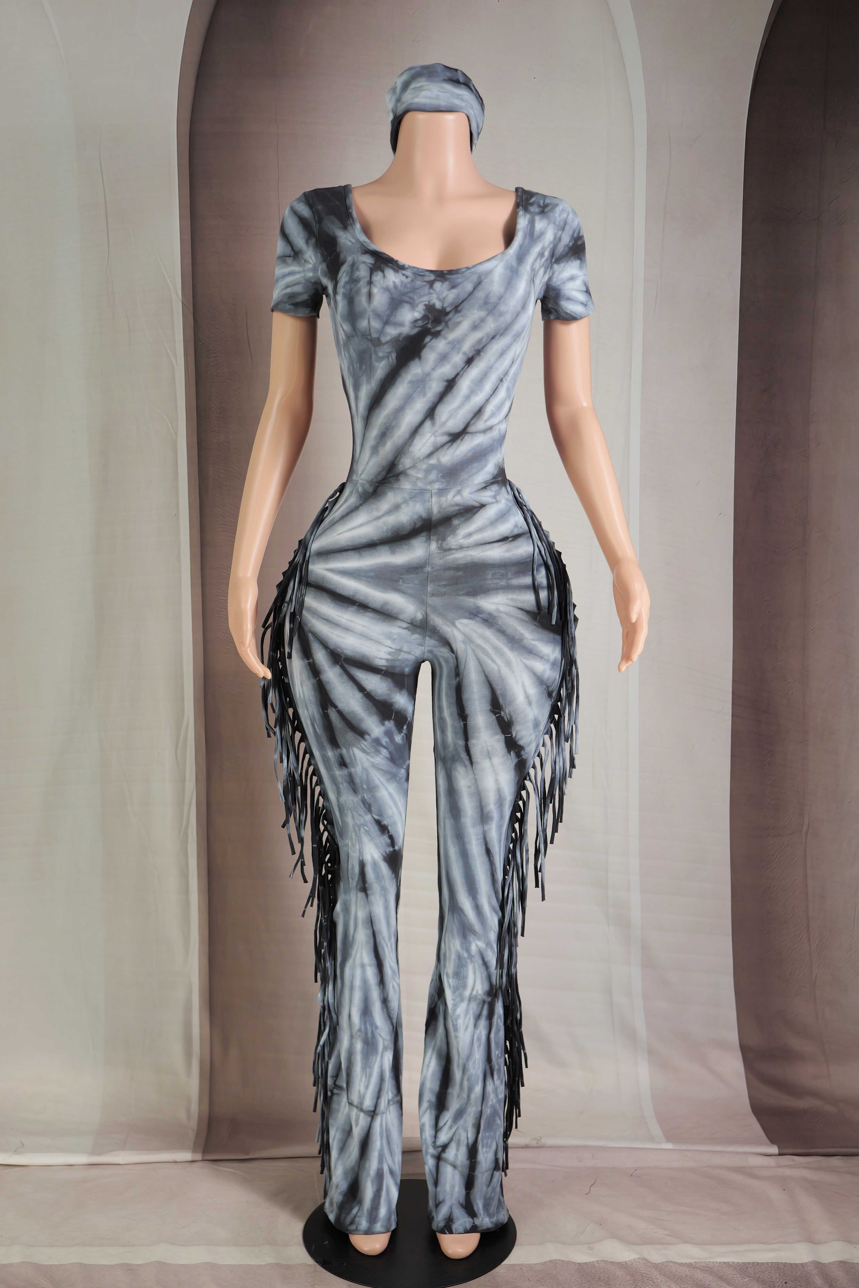 TIE DYE FRINGE JUMPSUIT WITH MATCHING HEADBAND