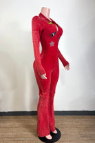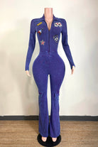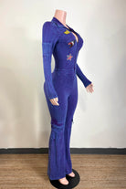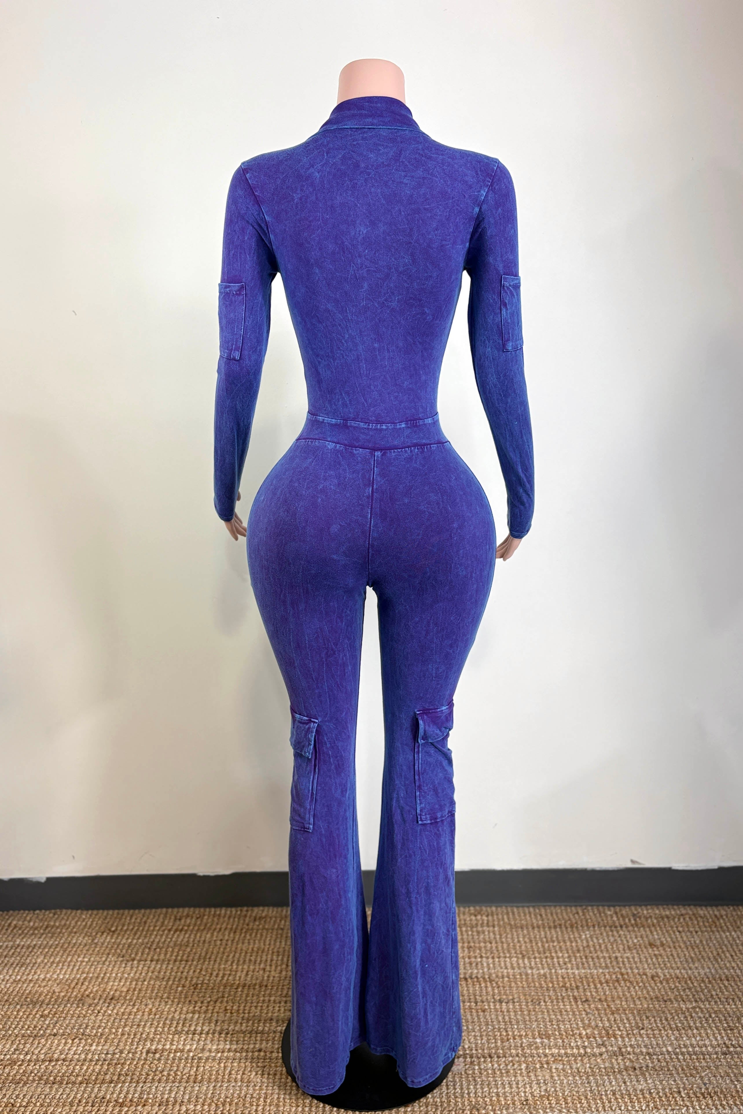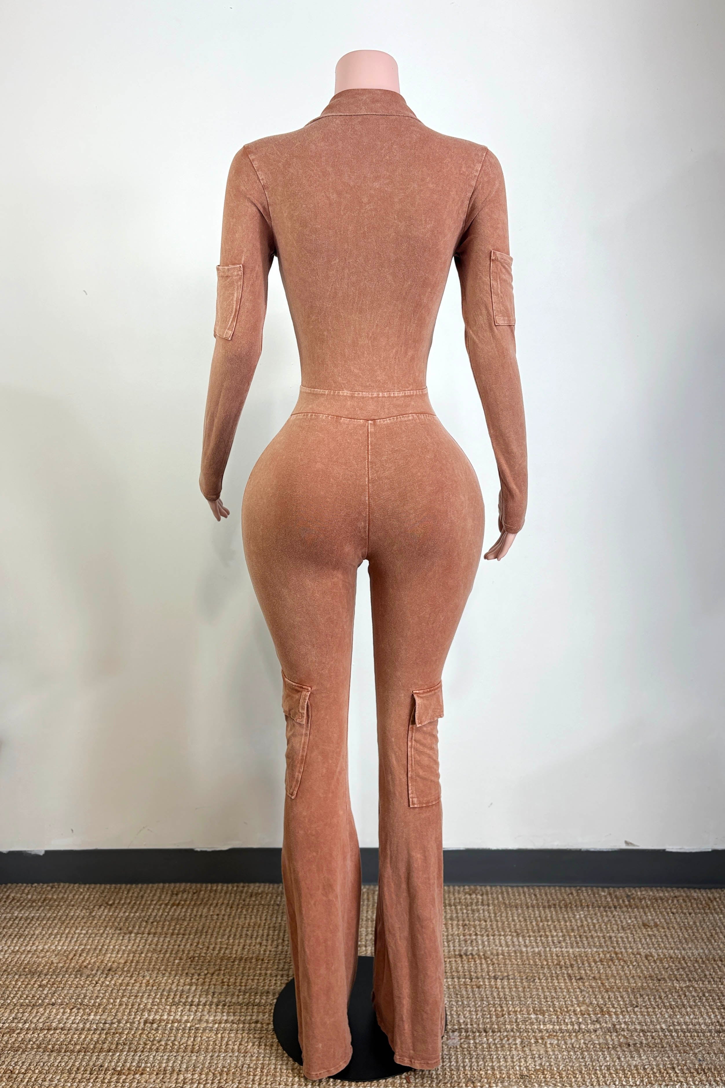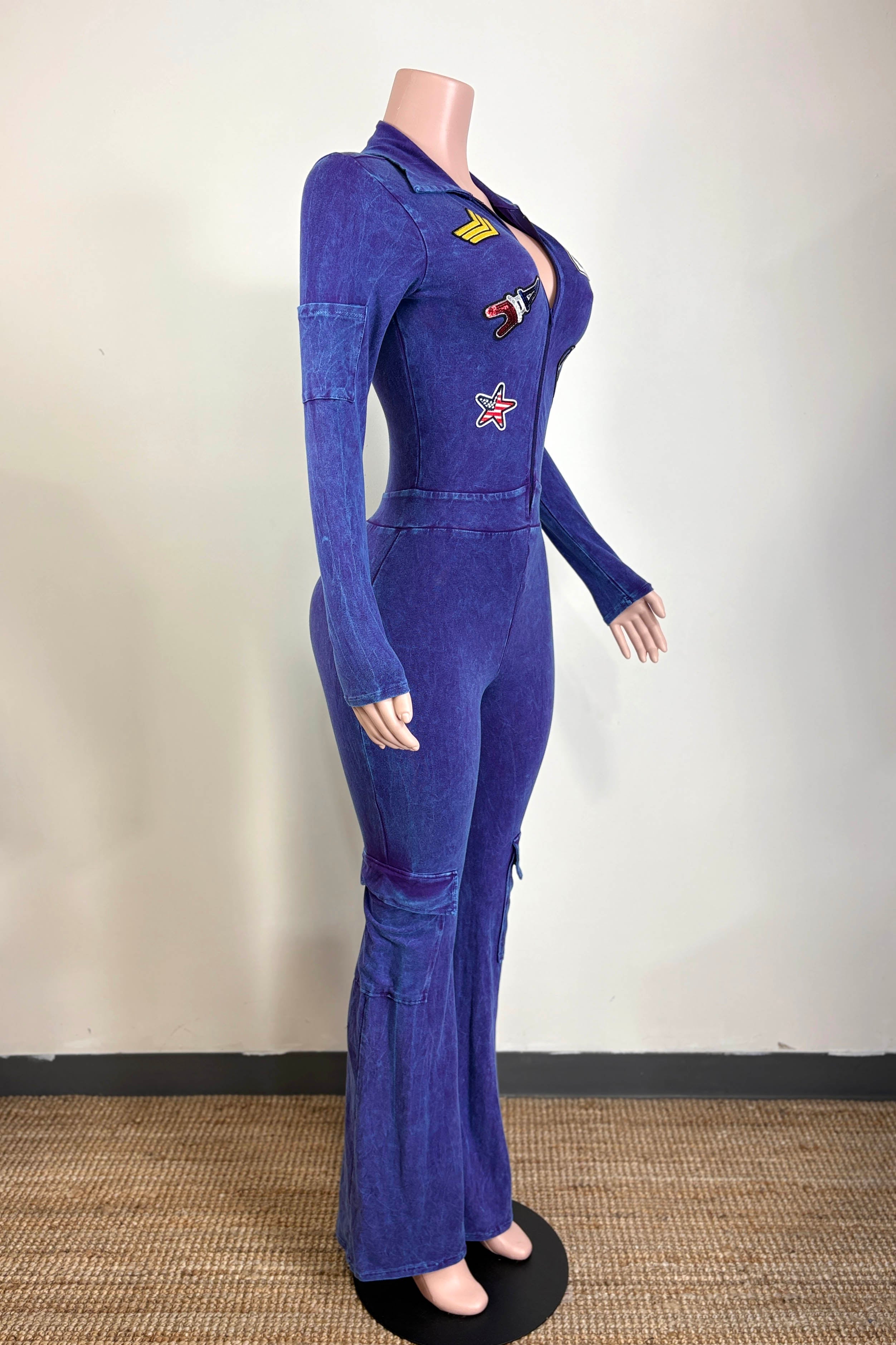 -MINERAL WASH-PATCH WORK DETAIL-COLLARED-FRONT ZIPPER DETAIL-SIDE CARGO POCKET-FLARE LEG-STRETCH-TALL GIRL FRIENDLY