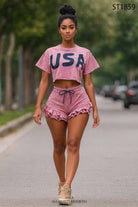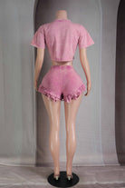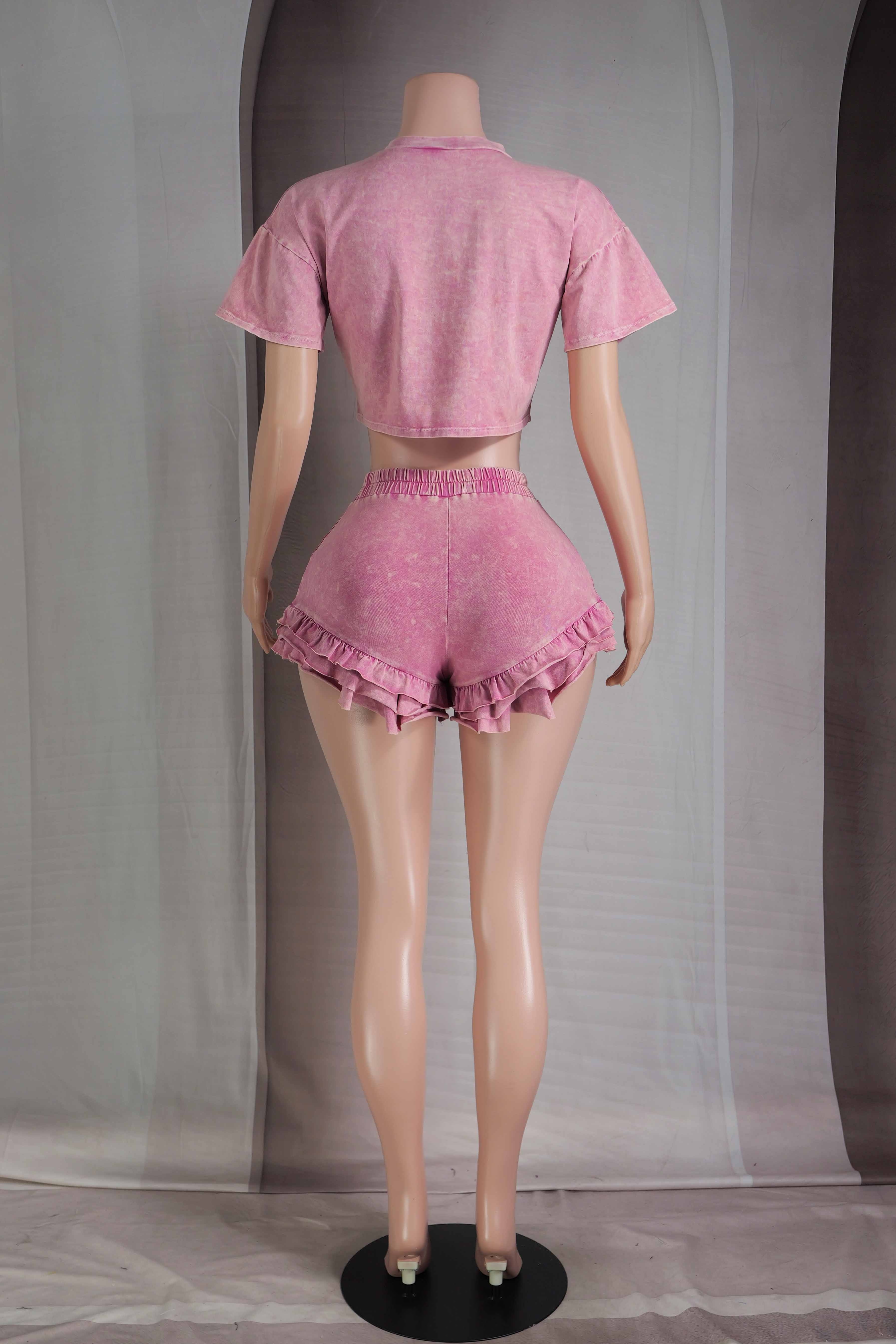 MINERAL WASH DENIM PATCH TOP & RUFFLED SHORT SET