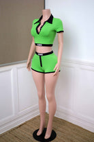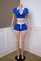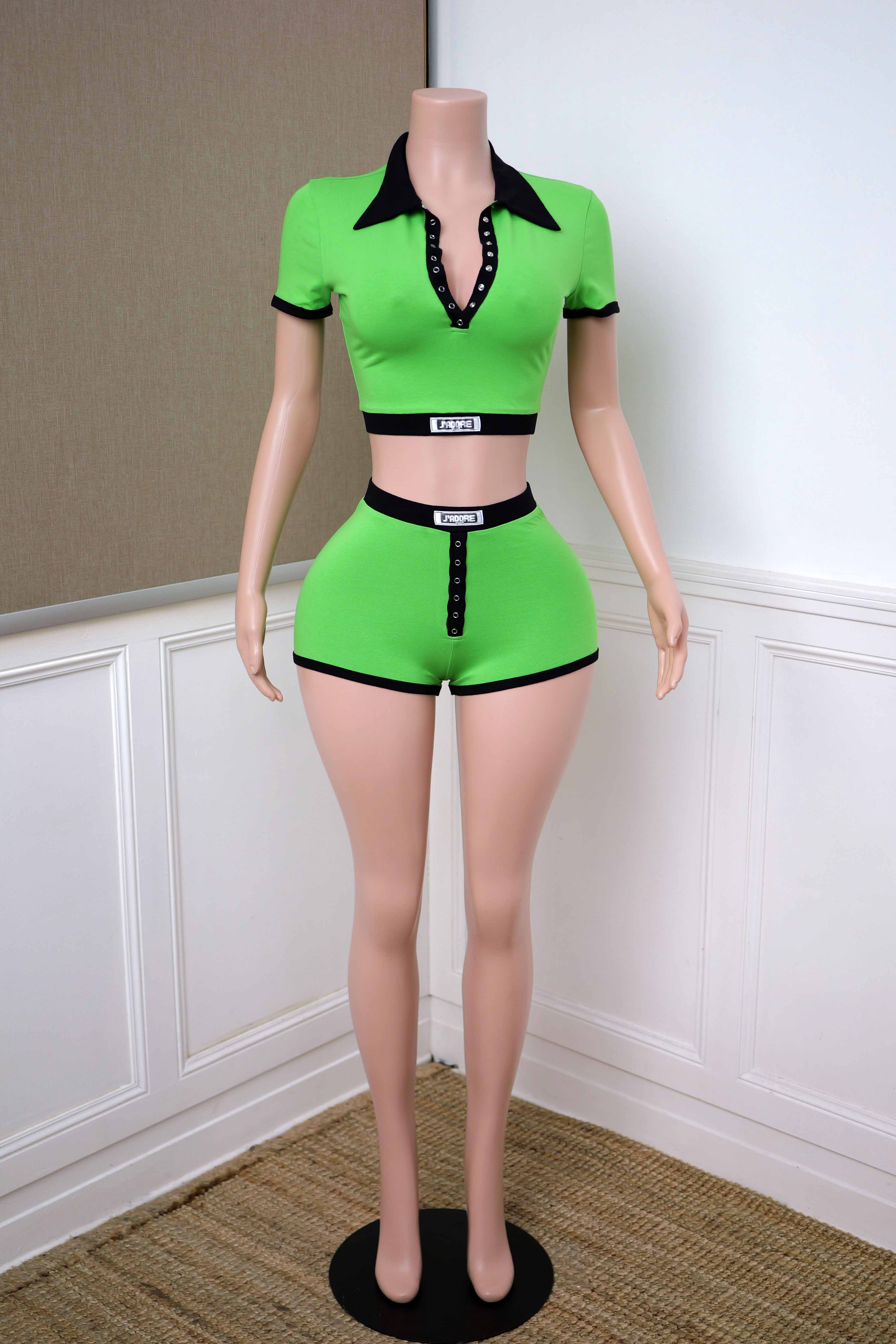 -COTTON JERSEY MATERIAL-SET COMES WITH TOP & BOTTOM-COLLARED CROP TOP WITH SNAP BUTTON CLOSURE-WHITE SATIN LABEL DETAIL-MICRO SHORT WITH SNAP BUTTON DETAIL-STRETCH