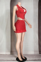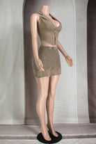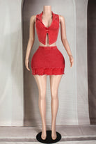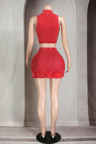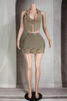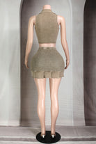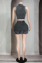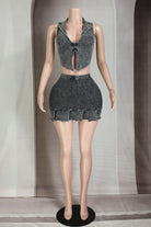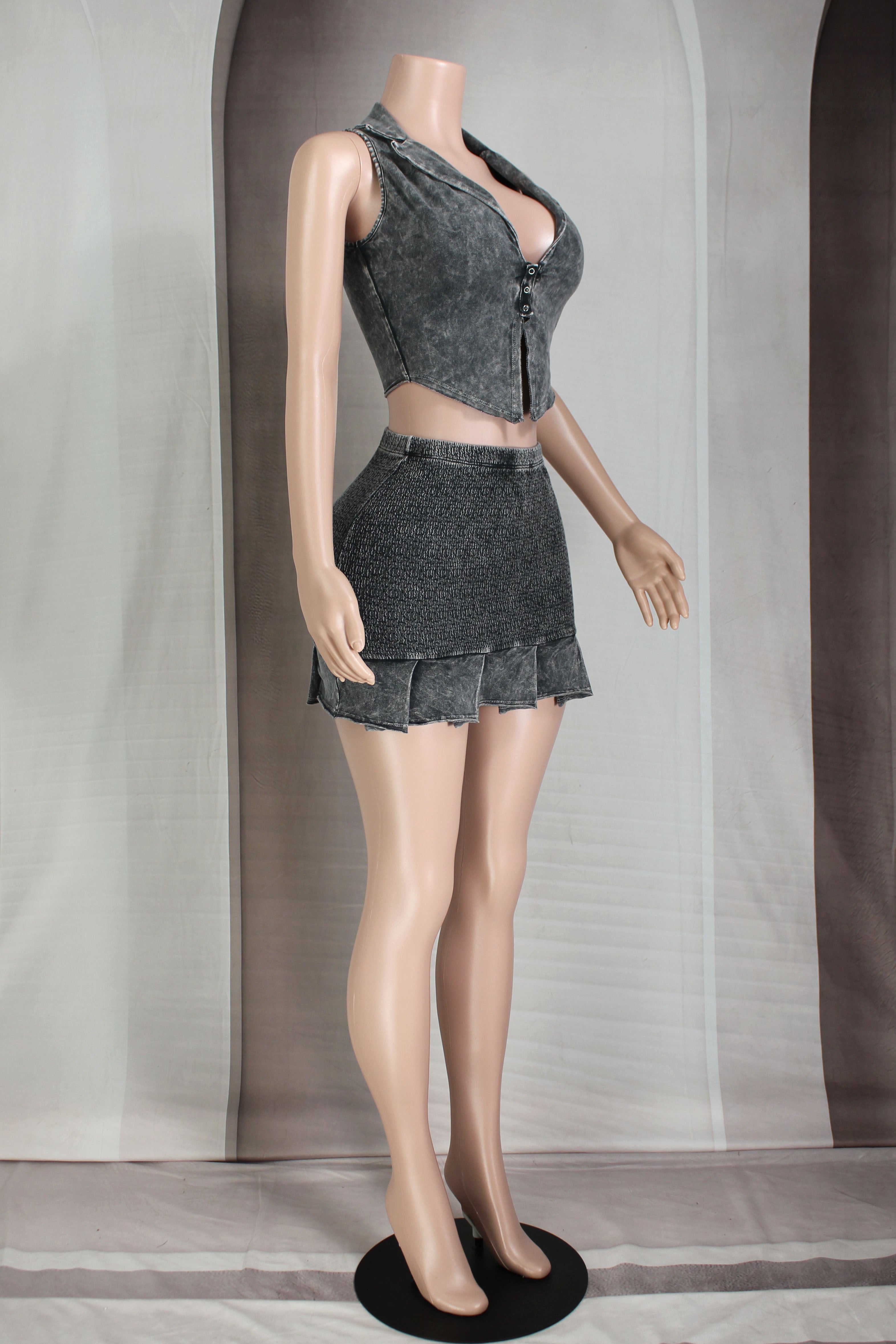 -MINERAL WASH-SET COMES WITH TOP & BOTTOM-COLLARED SLEEVELESS CROPPED TOP WITH SNAP BUTTON CLOSURE-ELASTIC WAISTBAND RUFFLED MINI SKIRT-BODYCON-STRETCH