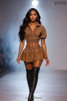 -OIL WASH-SET COMES WITH TOP & BOTTOM-CROPPED ZIP-UP SHORT SLEEVE JACKET-RUFFLED SHIRT WITH INNER SHORT AND ELASTIC WAIST-STRETCH