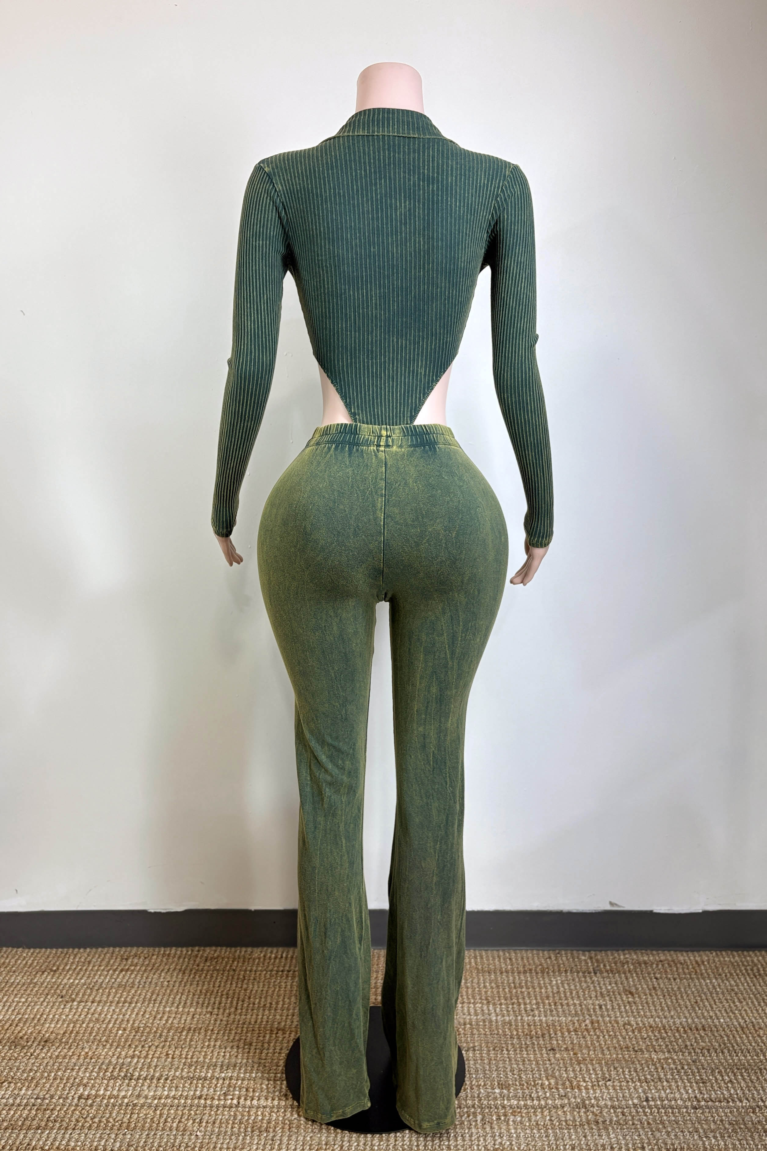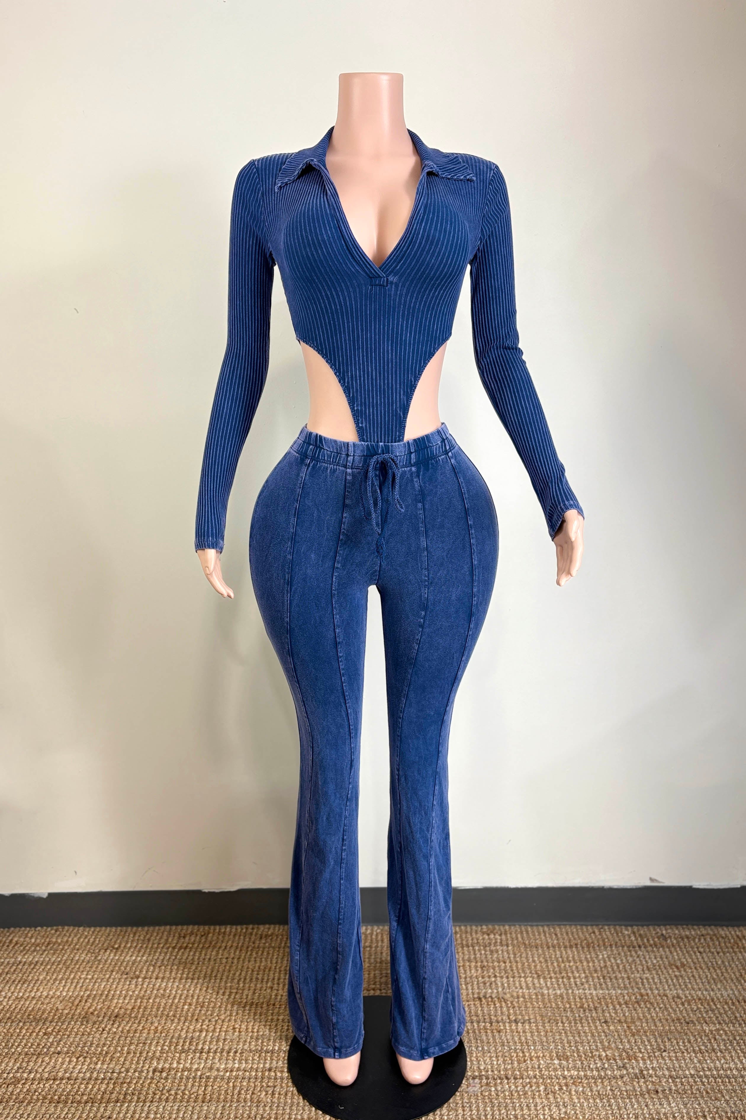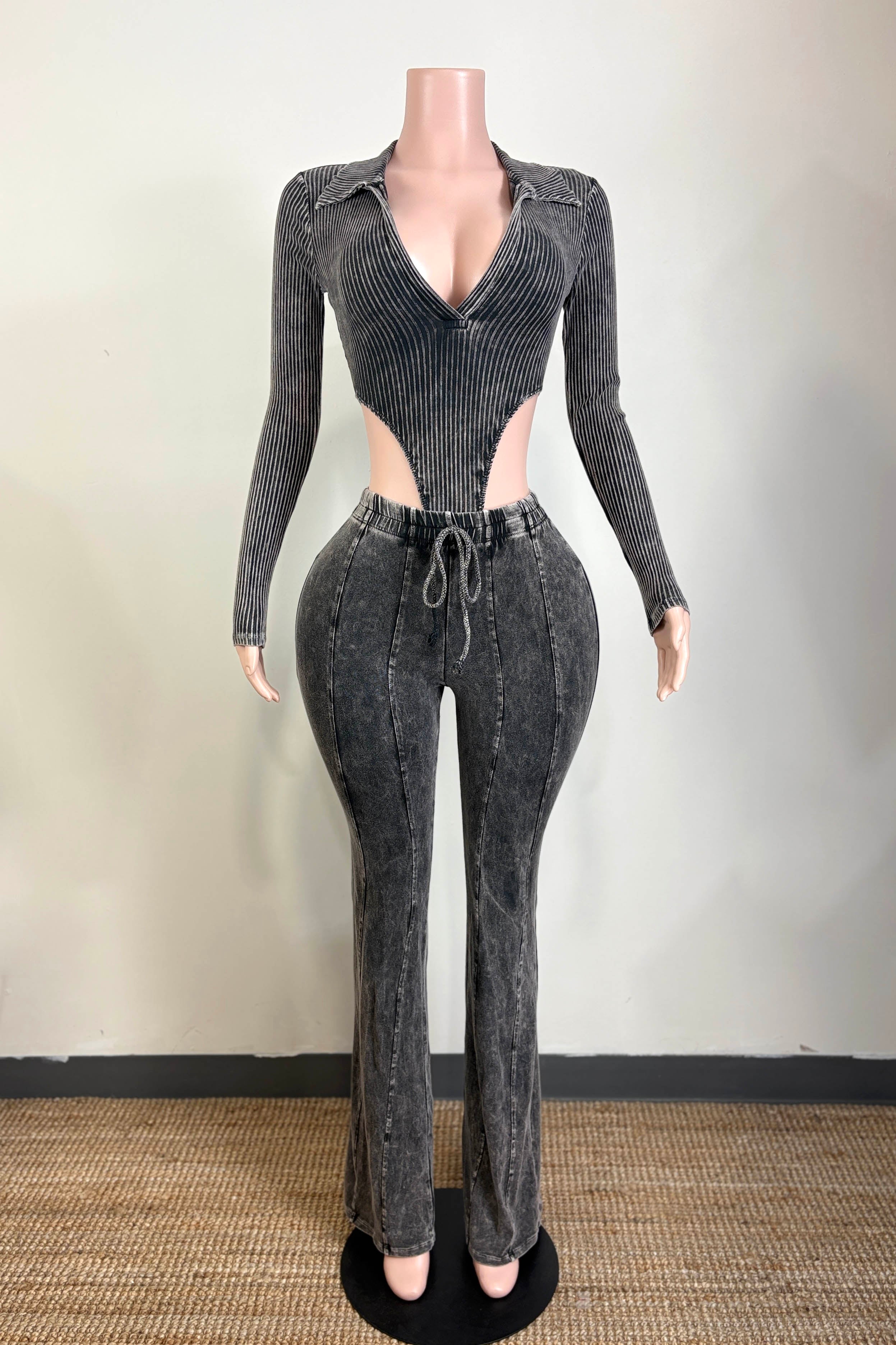 -MINERAL WASH-SET COMES WITH TOP & BOTTOM-DEEP-V COLLARED LONG SLEEVE-SIDE HIGH CUT BODYSUIT-ELASTIC WAISTBAND-FLARE LEG-TALL GIRL FRIENDLY-STRETCH