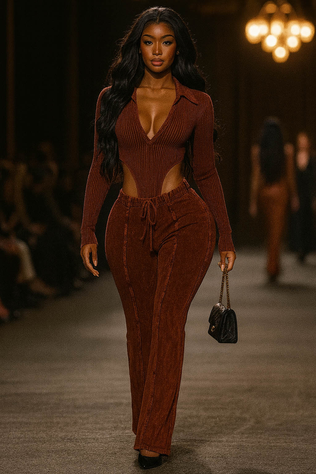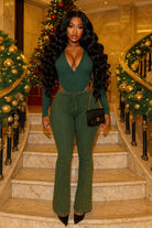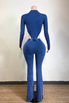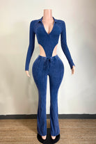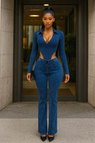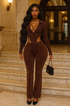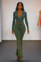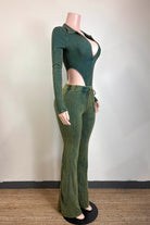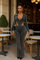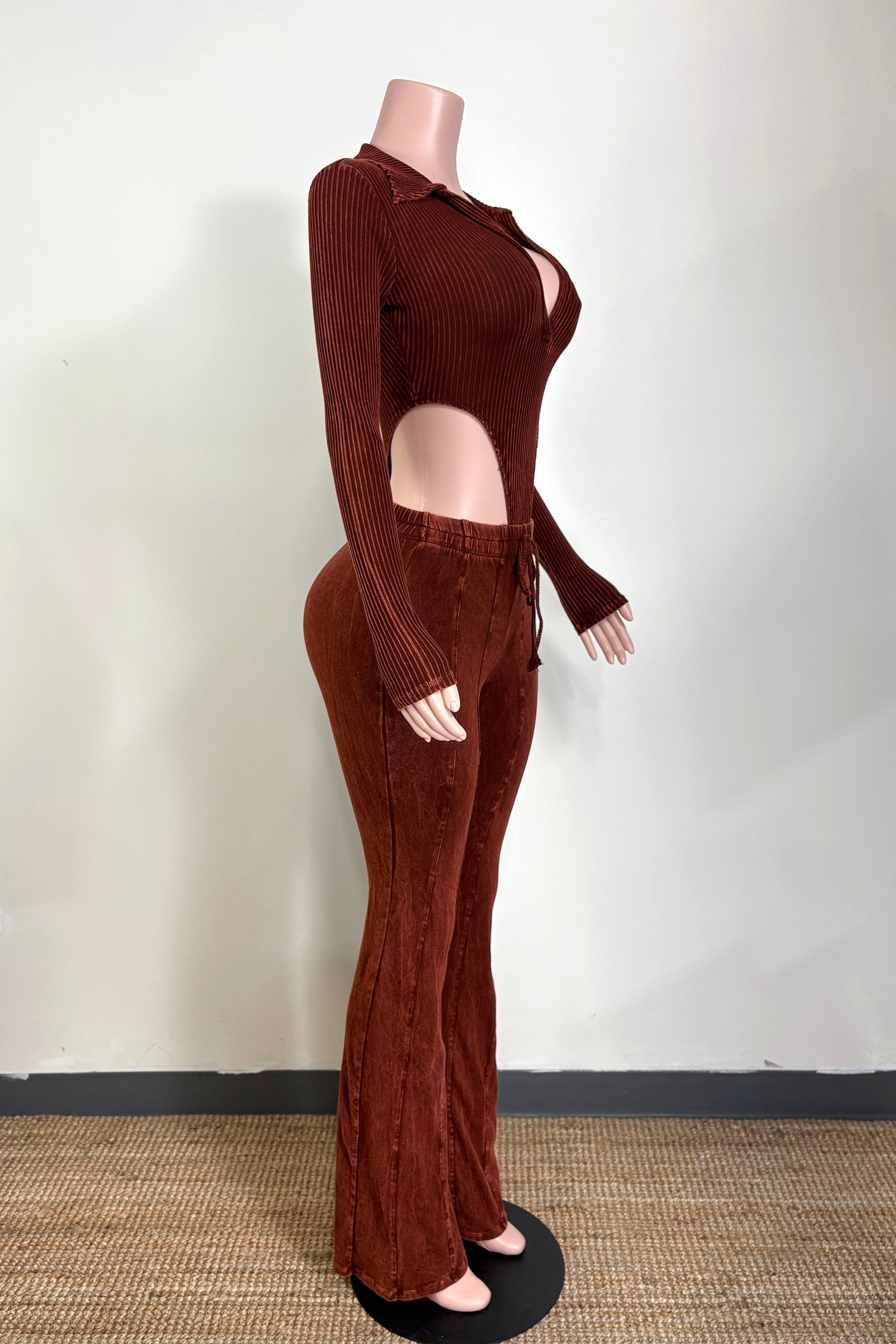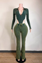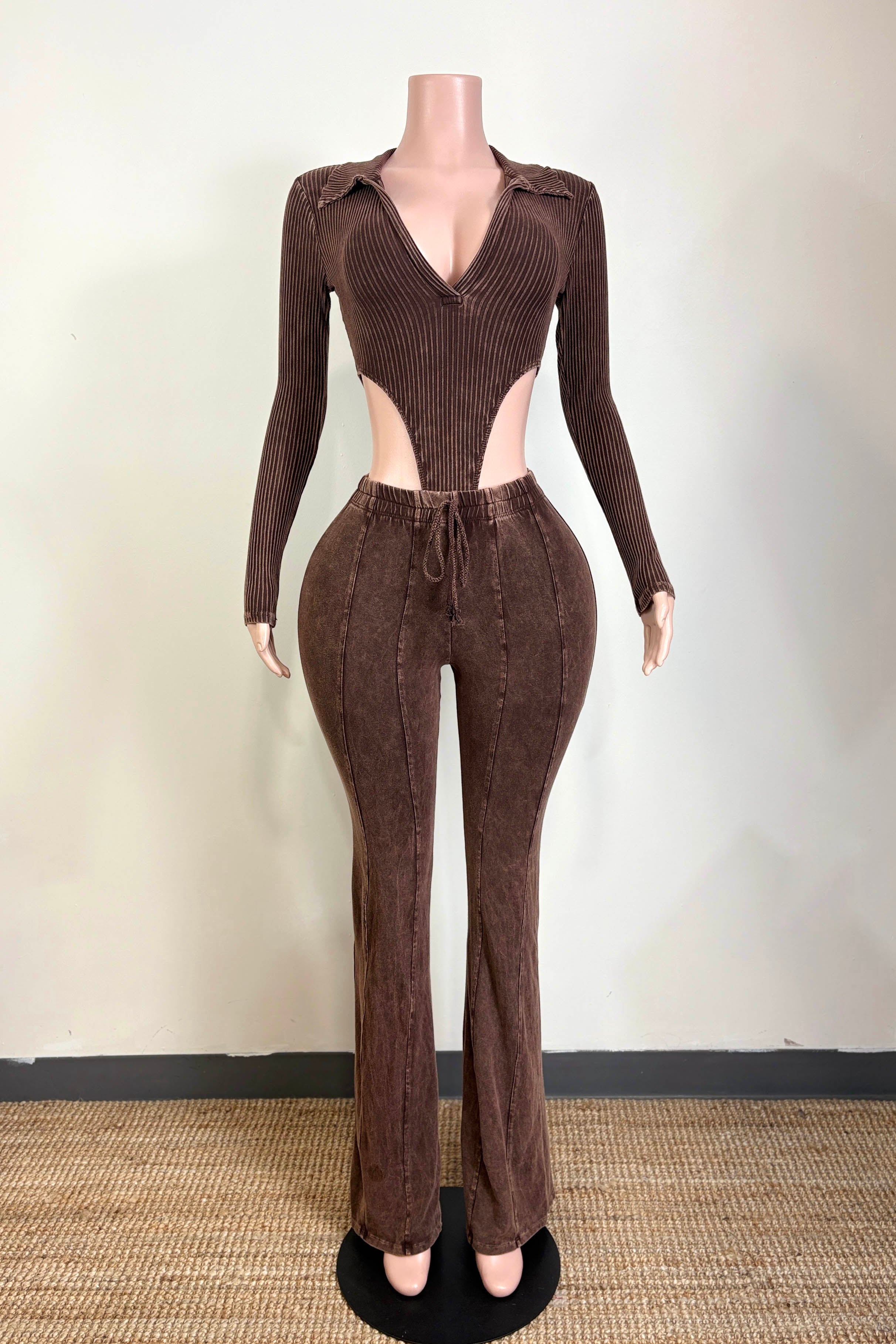 -MINERAL WASH-SET COMES WITH TOP & BOTTOM-DEEP-V COLLARED LONG SLEEVE-SIDE HIGH CUT BODYSUIT-ELASTIC WAISTBAND-FLARE LEG-TALL GIRL FRIENDLY-STRETCH