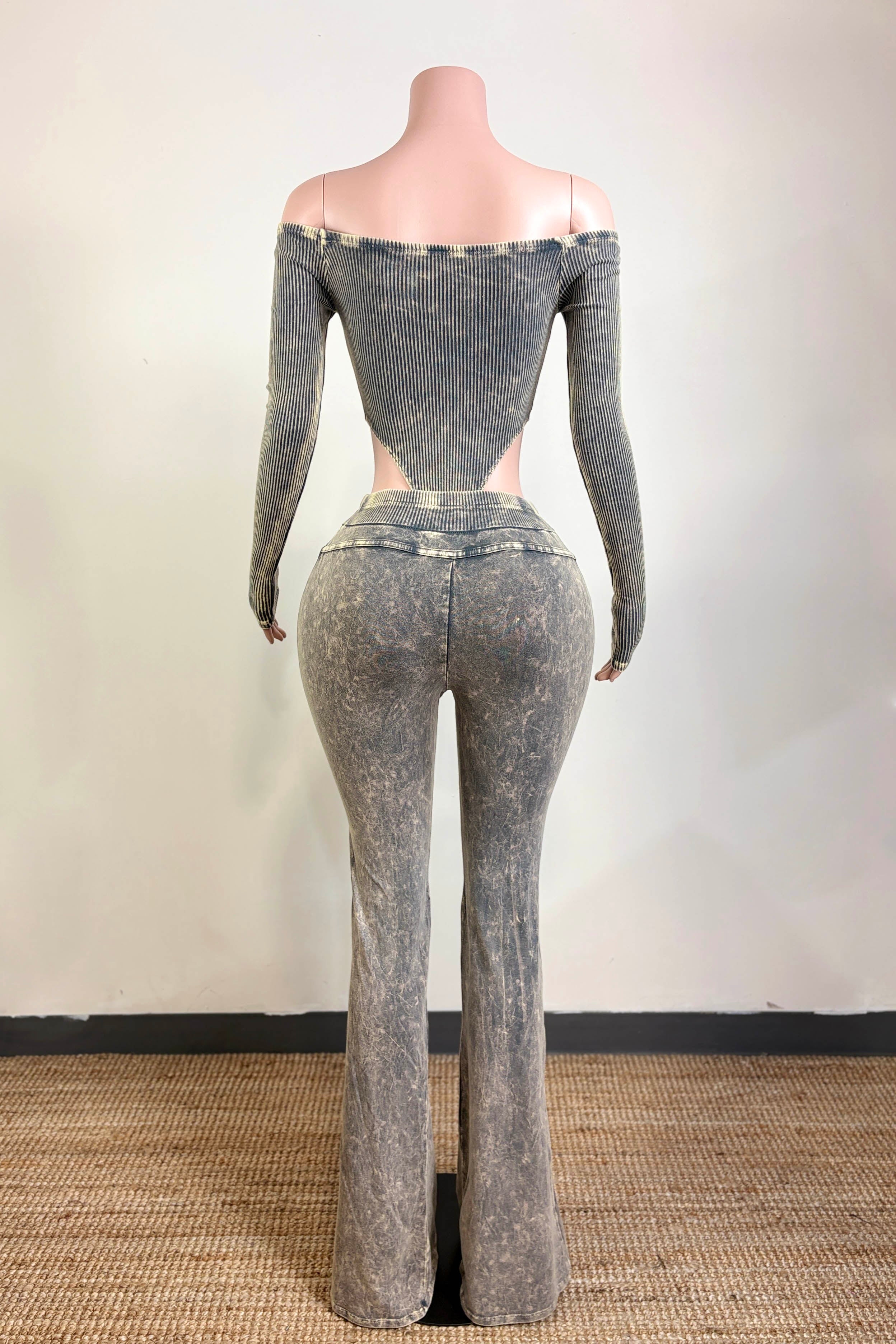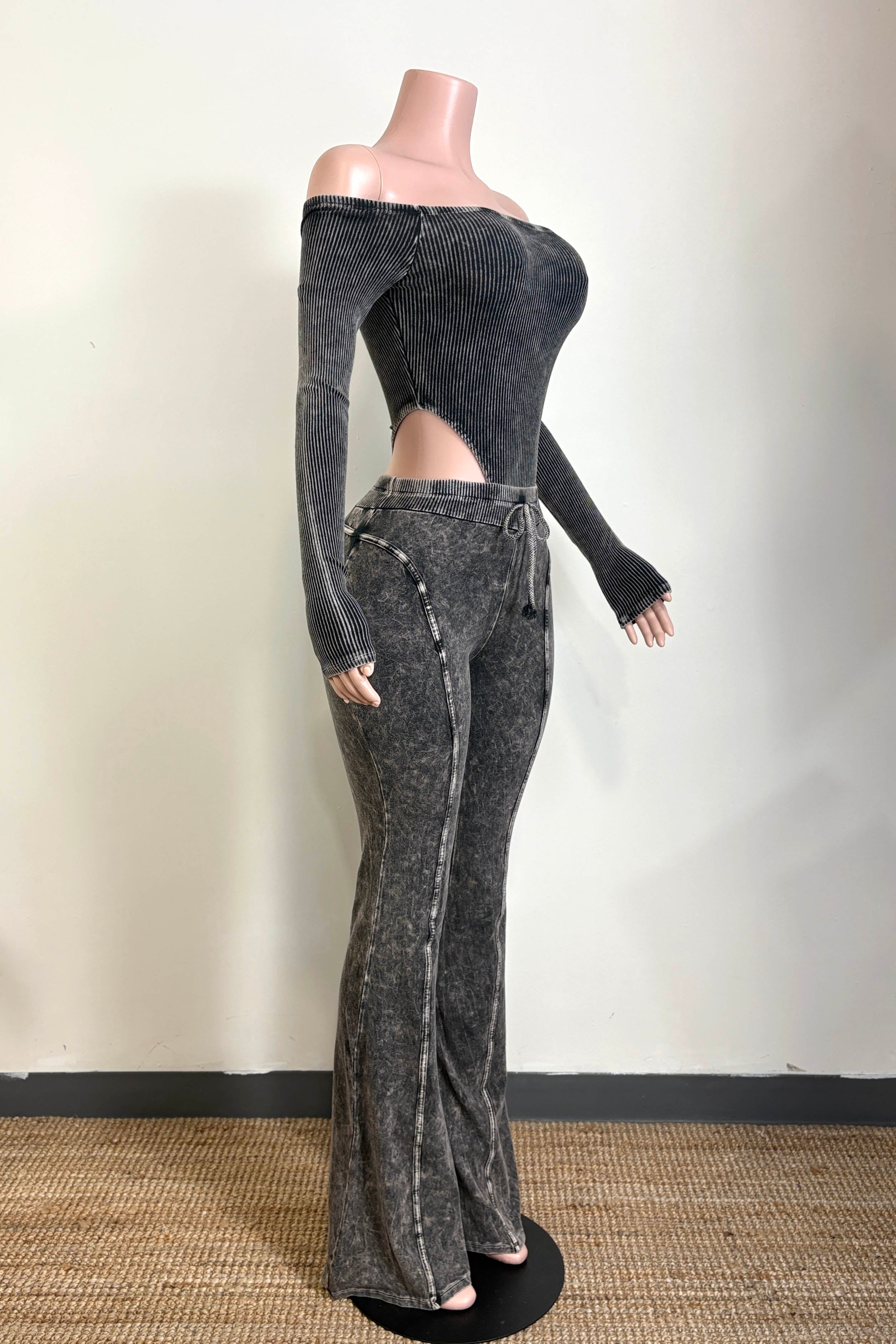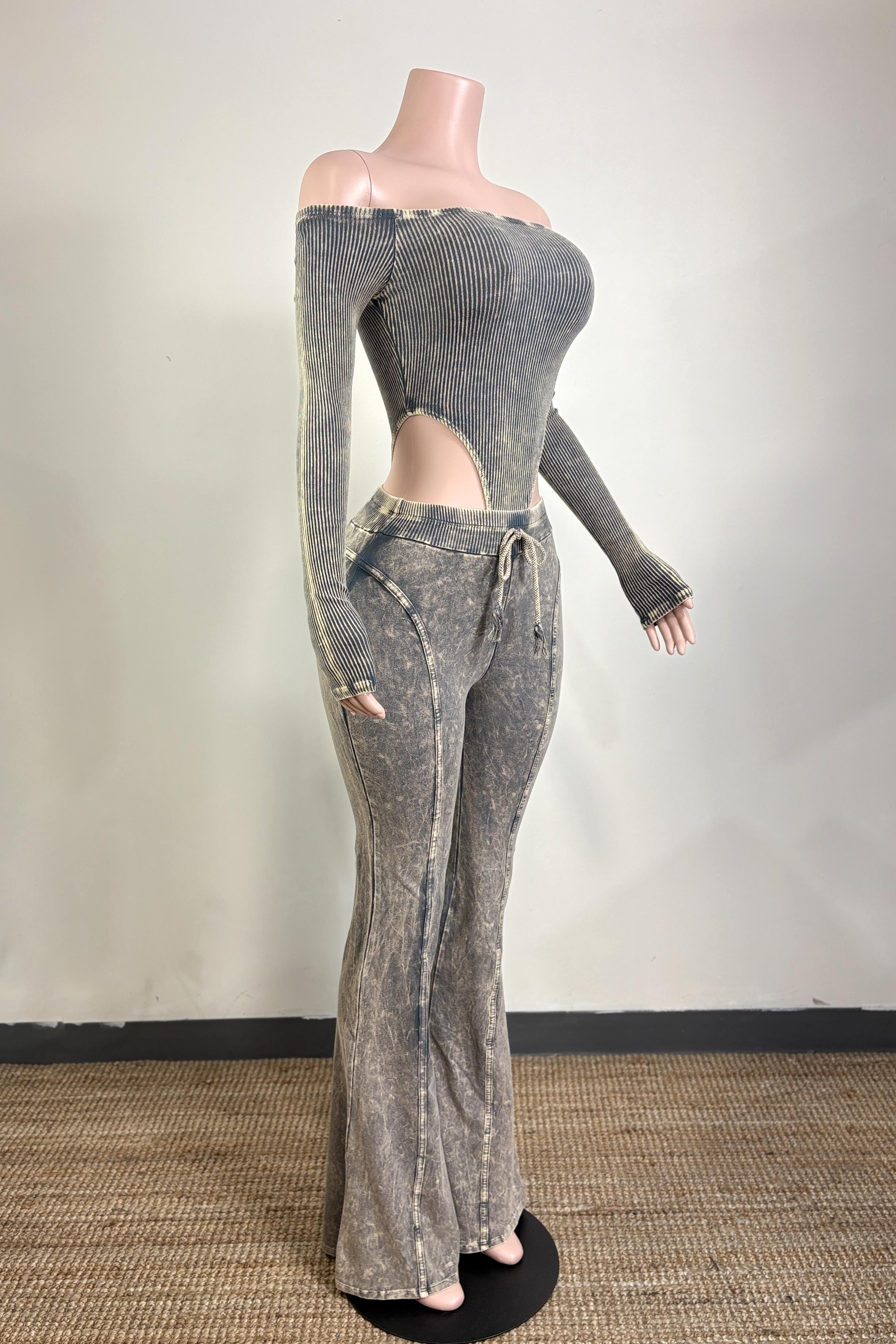 -MINERAL WASH-SET COMES WITH TOP & BOTTOM-OFF SHOULDER BODYSUIT-LONG SLEEVE-ELASTIC WAIST-FLARE LEG-TALL GIRL FRIENDLY-STRETCH