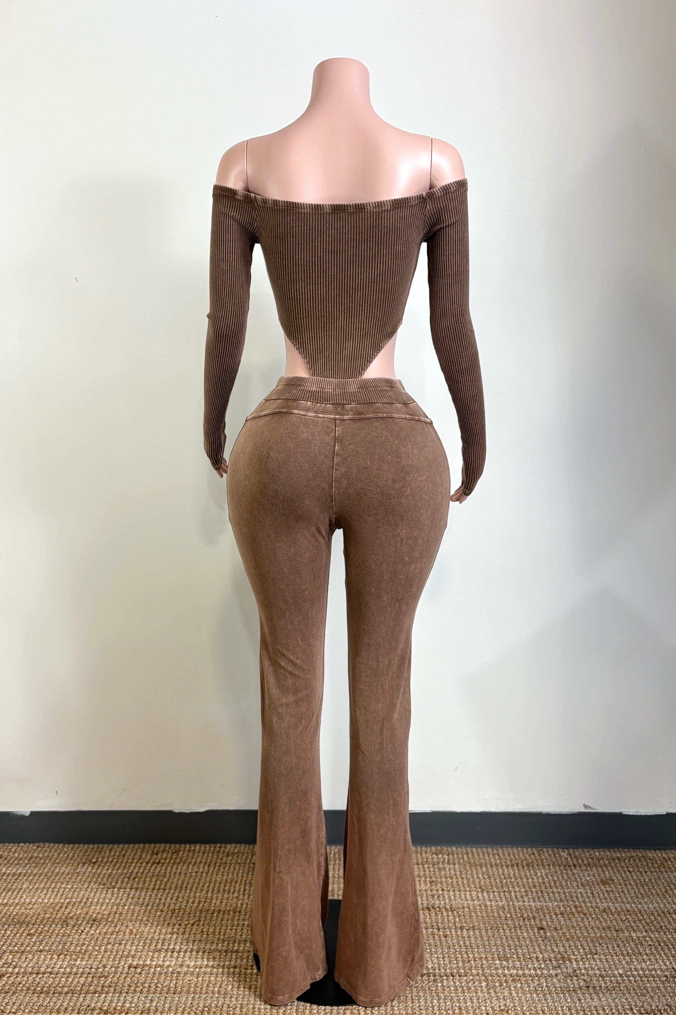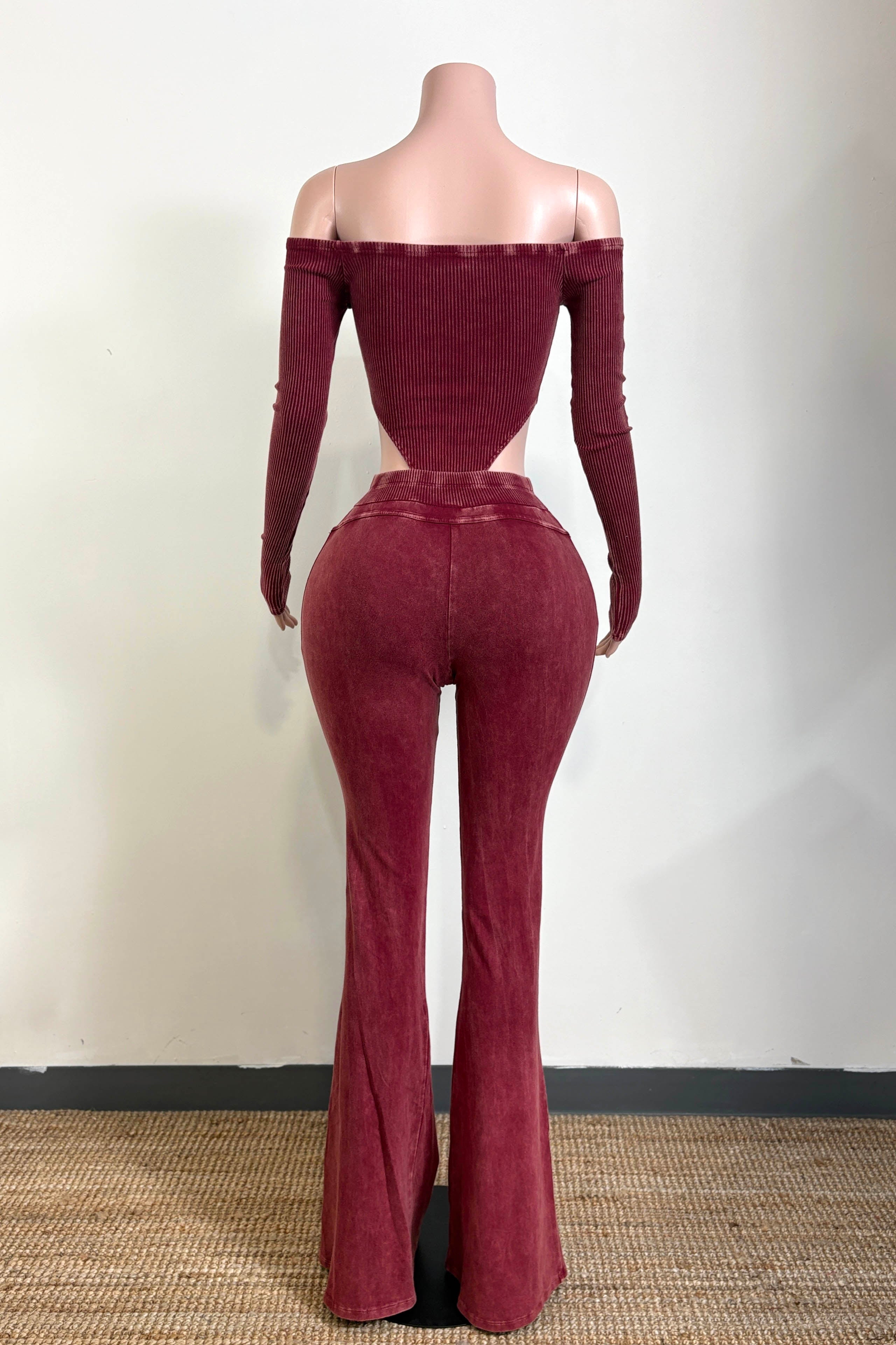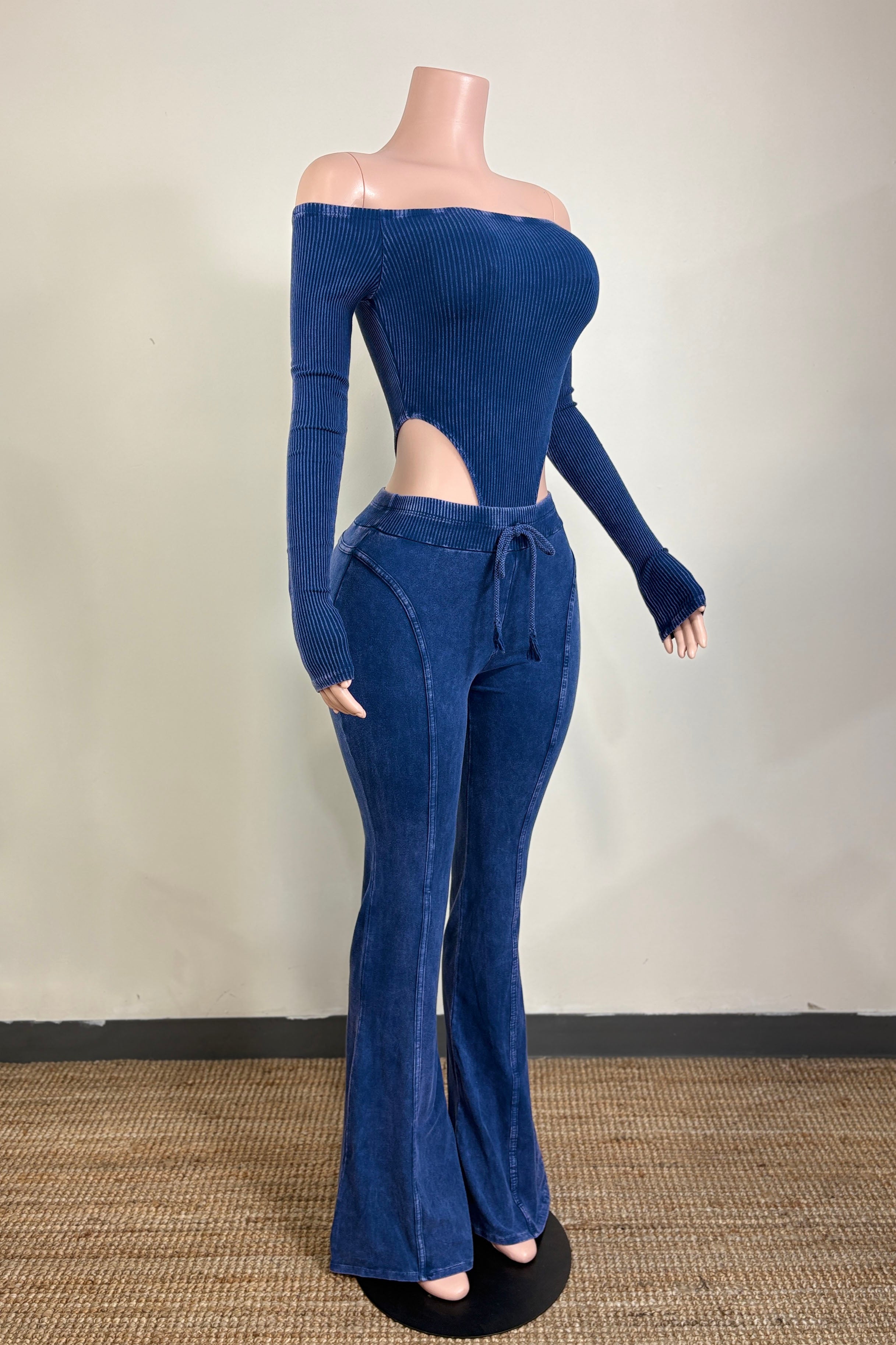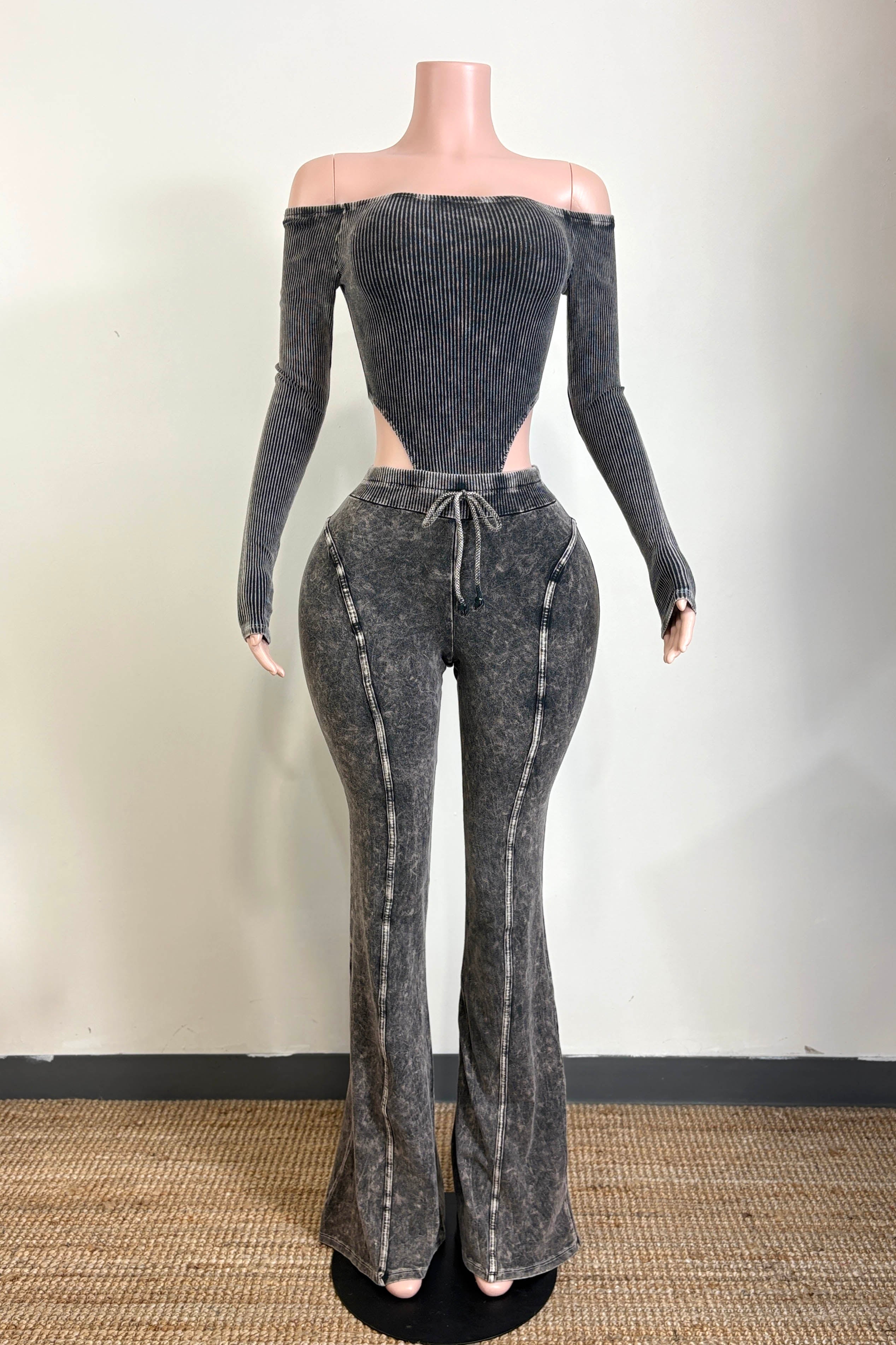 -MINERAL WASH-SET COMES WITH TOP & BOTTOM-OFF SHOULDER BODYSUIT-LONG SLEEVE-ELASTIC WAIST-FLARE LEG-TALL GIRL FRIENDLY-STRETCH