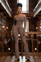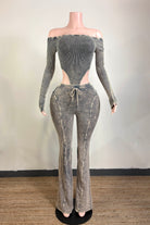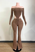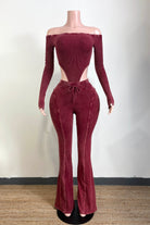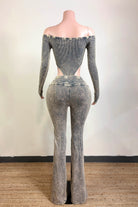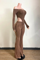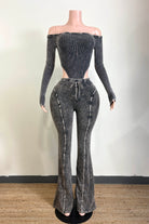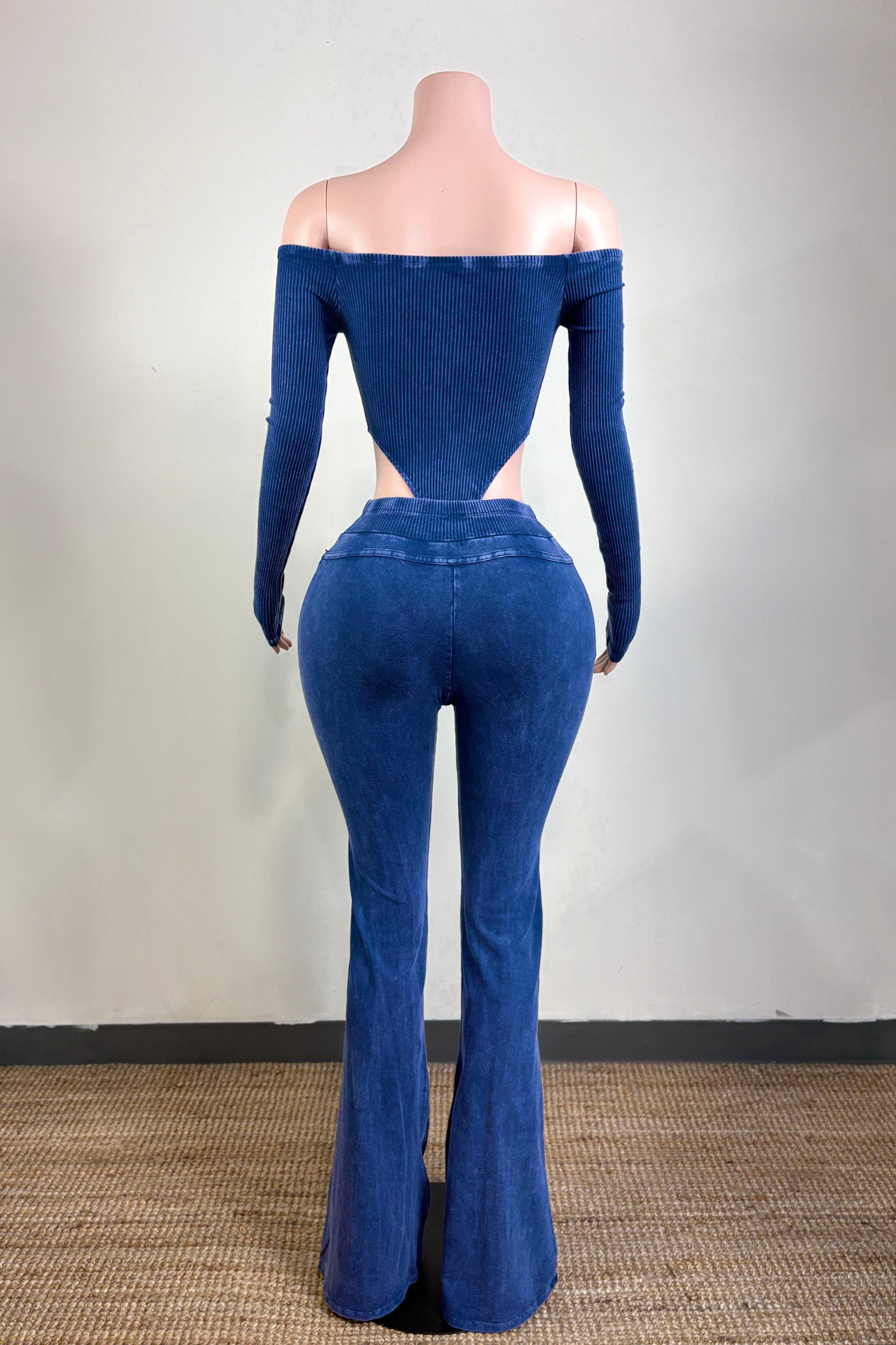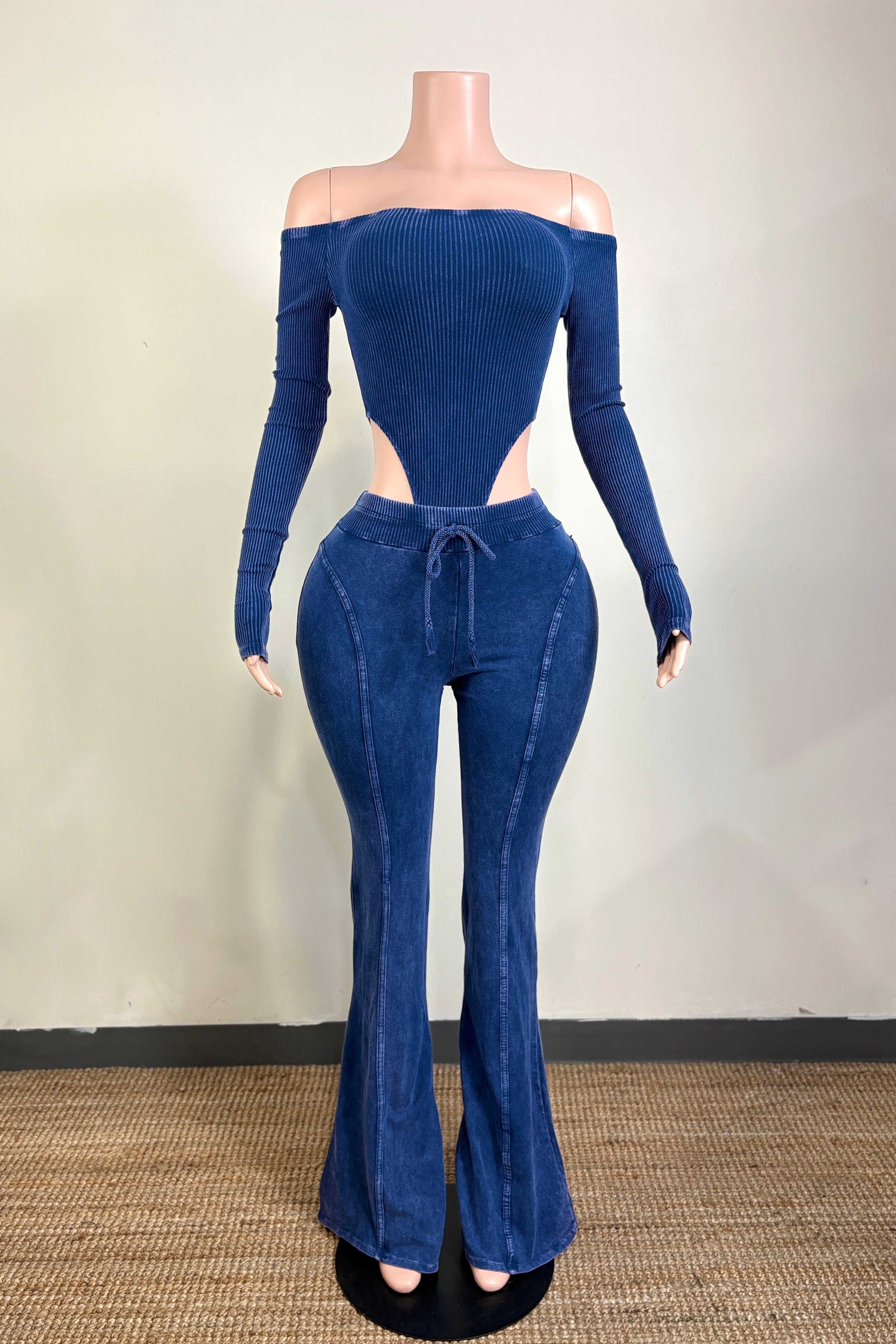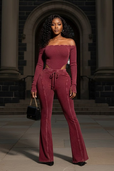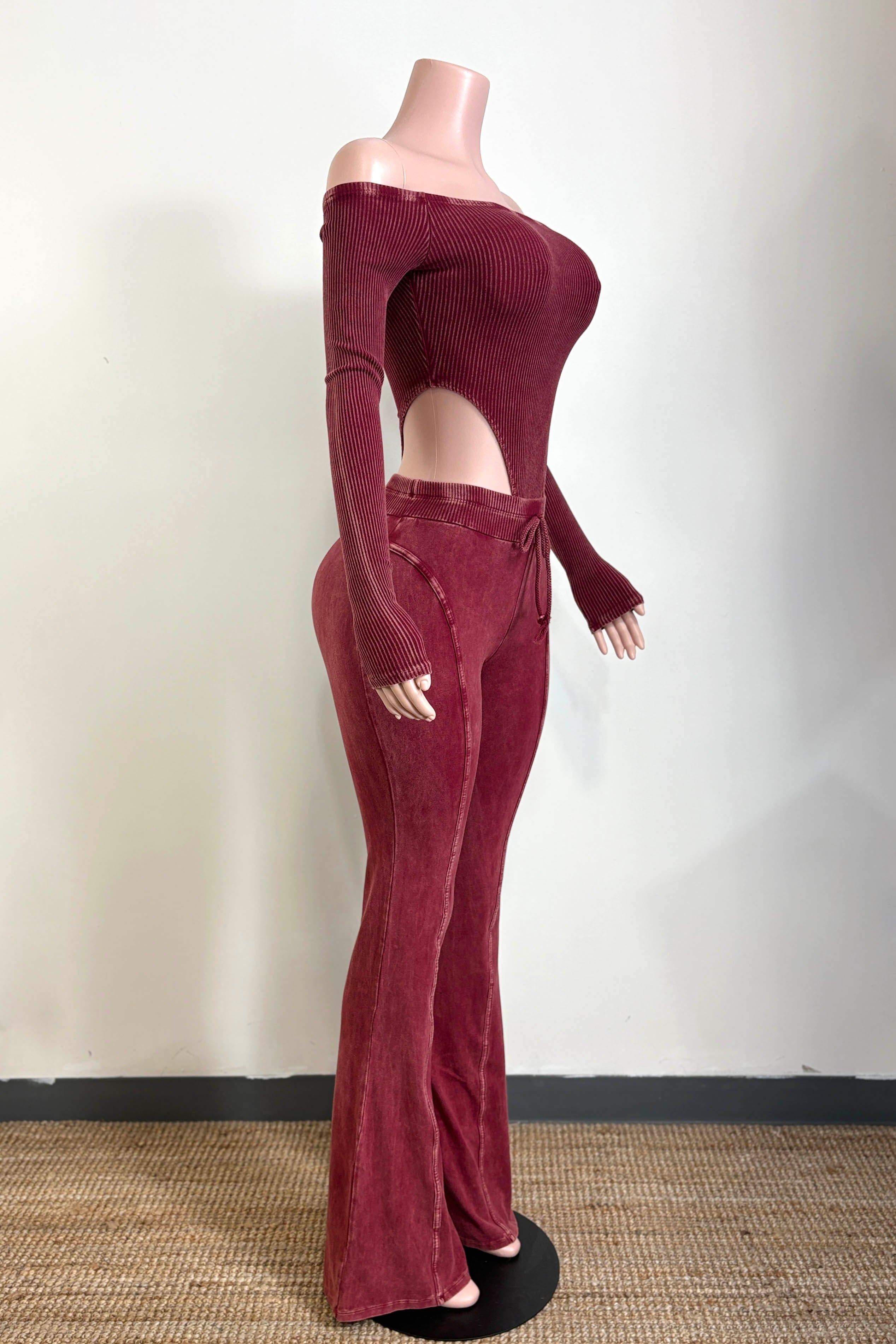 -MINERAL WASH-SET COMES WITH TOP & BOTTOM-OFF SHOULDER BODYSUIT-LONG SLEEVE-ELASTIC WAIST-FLARE LEG-TALL GIRL FRIENDLY-STRETCH